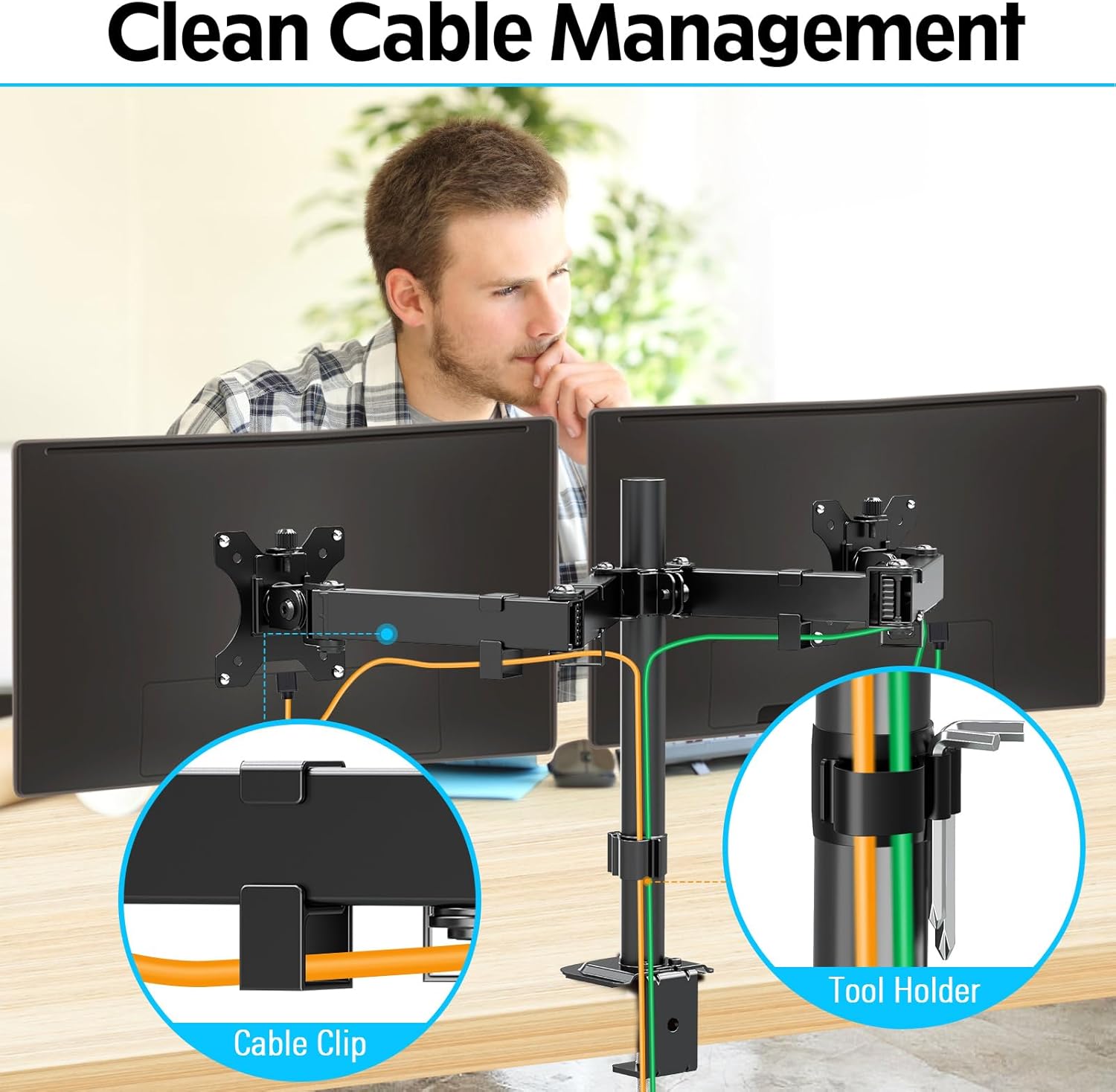 Free Up Your Desk Space: One solid base supports two monitor arms, helping you save table space and reduce clutter. Cable clips keep cables organized and protected. Just enjoy your working, gaming, or viewing hours in a more comfortable environment.