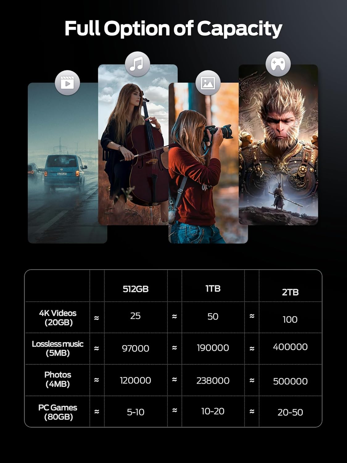 【Ultra-Fast Speed】USB3.2 Gen2x2 interface, offering a read speed of up to 2100MB/s and a write speed of 1800MB/s. Save more time and energy when transmitting and uploading files, and greatly improve work efficiency. NOTE: The data source is from the laboratory. Please use the necessary professional software, professional equipment, as well as the USB3.2 Gen2x2 interface or Thunderbolt 5 interface