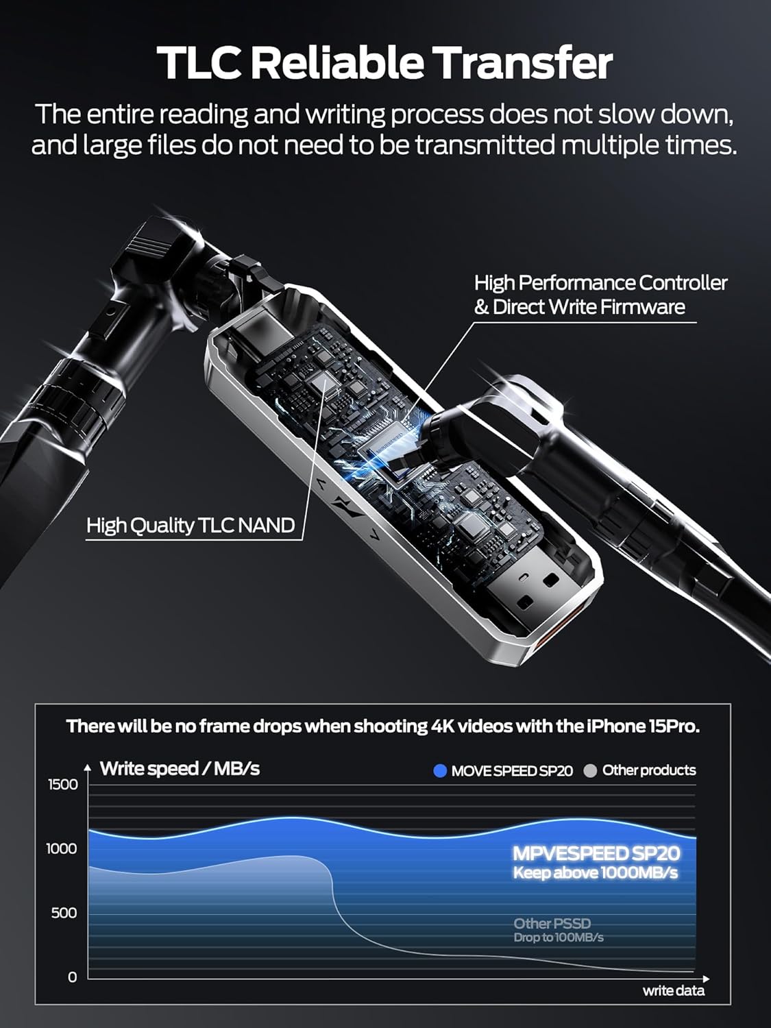 MOVE SPEED 1TB External SSD, 2100MB/s TLC Reliable Transfer Portable SSD with USB 3.2 Gen2x2 + Type C, Cool USB Drive for Phone/Windows/Mac (SP20)