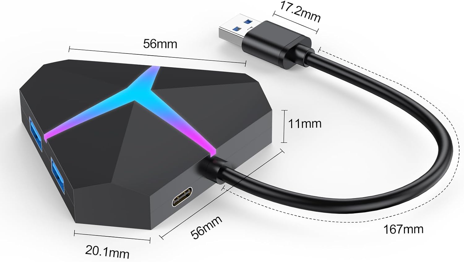 【Geometric & Heat Dissipation Design】 FEMORO 4-Port usb 3.0 hub adopts dimensional diamond cool design, with colorful LED indication light. Using high temperature resistant and high-quality ABS plastic, the surface is delicately frosted, andseveral LED light colors can be changed after connection