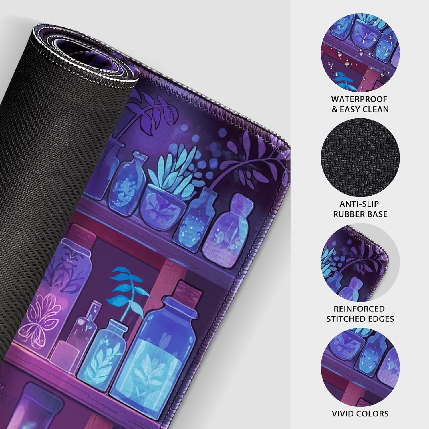 MYSTICAL DESIGN: The desk mat features a gothic-inspired bookshelf with glowing potion bottles, magical flora, and enchanted vessels in ethereal blue and purple hues, perfect for fantasy enthusiasts. This large gaming mouse pad is not just a mouse pad, but also a good companion to accompany you in work and study, adding a touch of fun to your workspace