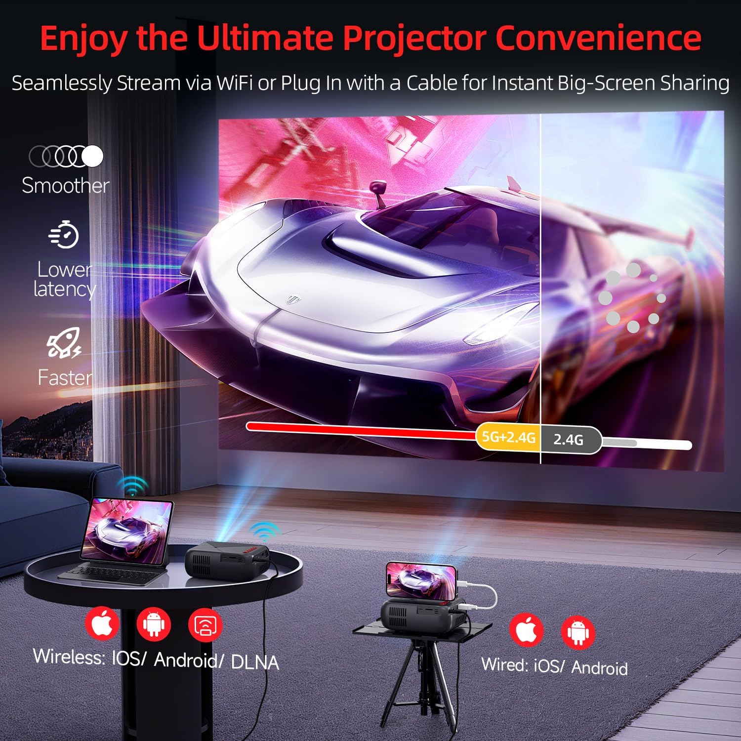 【Bluetooth 5.2 & Dual-Band WiFi for More Stable Connections】Nasin VF290WF mini projector supports the latest Bluetooth 5.2 technology, making it easy to connect to wireless headphones, speakers, and other devices; The portable projector is equipped with 2.4G/5G WiFi and DLNA, enabling seamless connection to smartphones and tablets for wireless screen mirroring, minimising interference, and allowing you to enjoy the pleasure of watching movies on a large screen anytime, anywhere.
