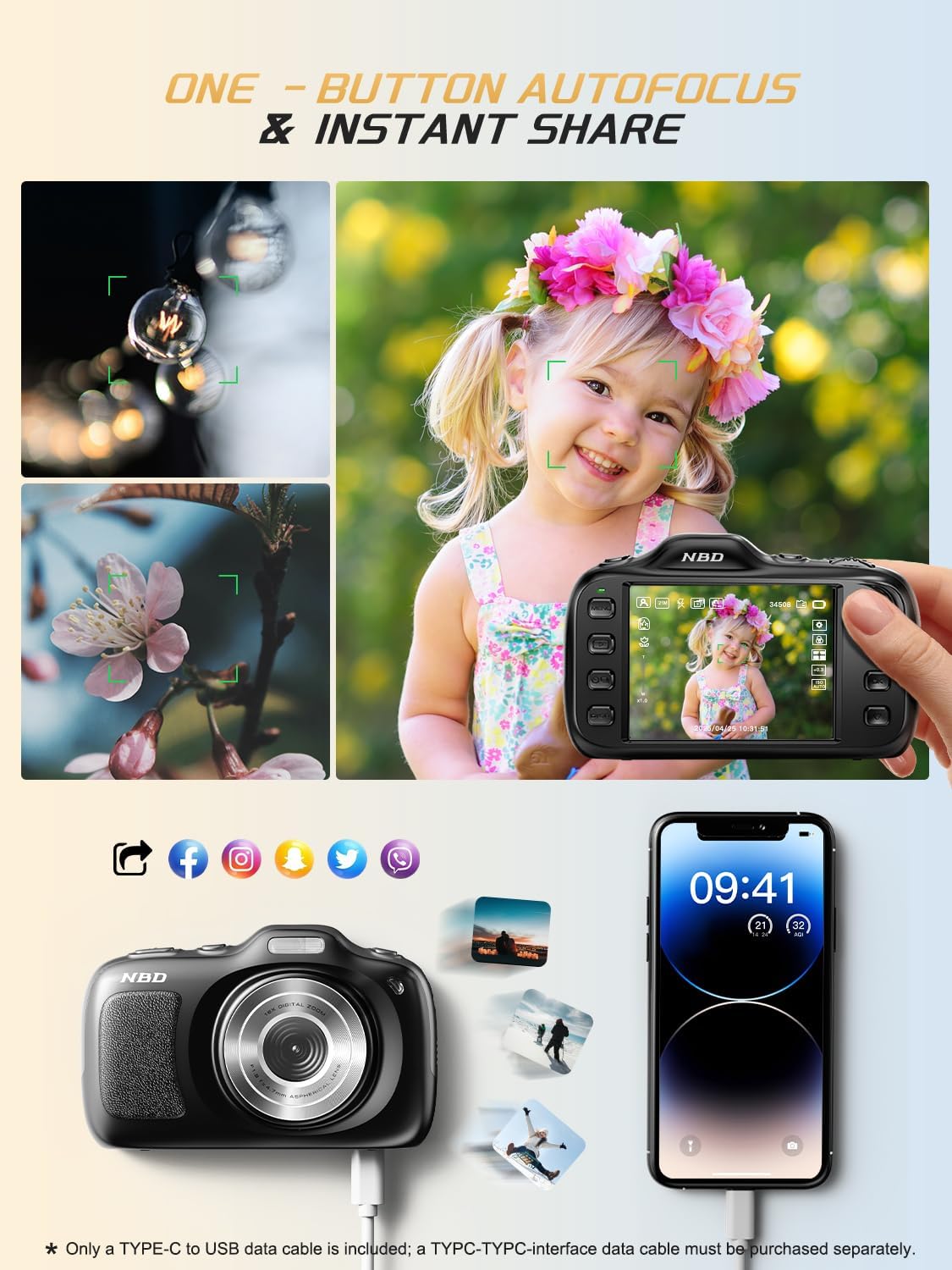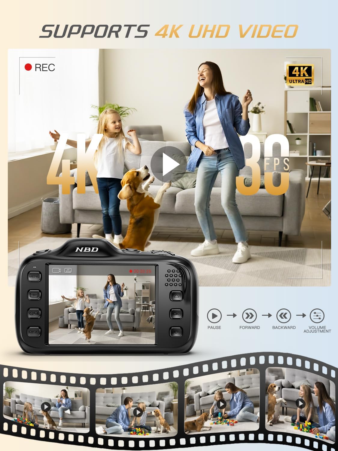 NBD 64MP Digital Cameras for Photography,4K Point and Shoot Camera,16X Zoom Compact Travel Cameras, Auto Focus Camera for Beginners Teens Kids and Lover Gift,Includes 32GB TF Card (Black)