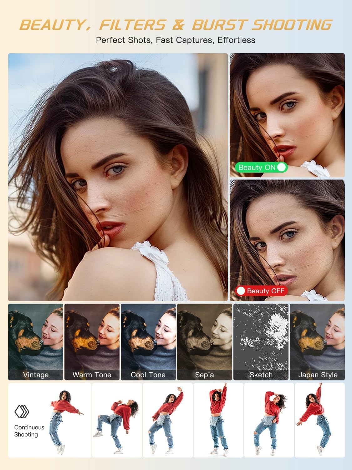 【64MP & 4K Camera with Beauty Mode】: Capture ultra-clear 4K videos and 64MP photos with this digital camera for photography. Features built-in beauty enhancement, F1.8 aperture for low-light clarity, and auto-focus precision. Perfect for vlogging, YouTube content, and travel photography.