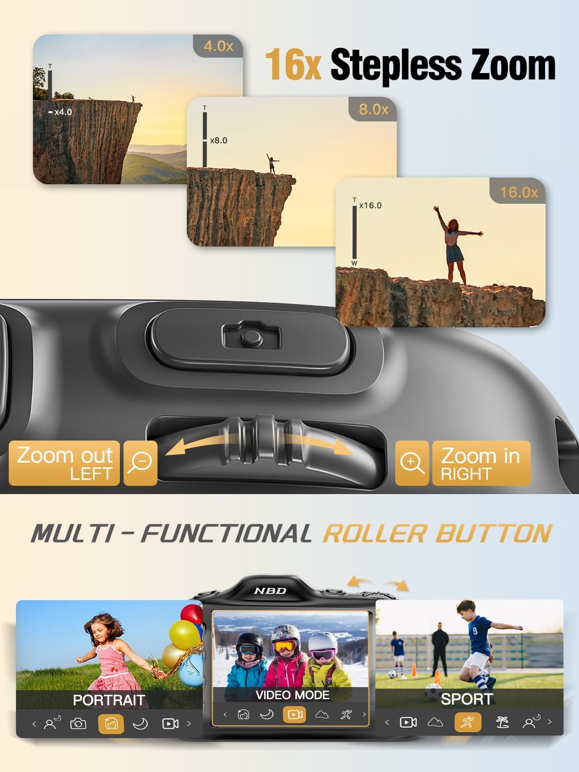 【16X Zoom & Auto Focus Camera】: Snap distant details clearly with robust 16X digital zoom and quick auto focus. Features anti-shake stabilization for clear action shots and multiple scene modes (Sport/Portrait/Night). Perfect for kids’ soccer games, park outings, and backyard family moments.
