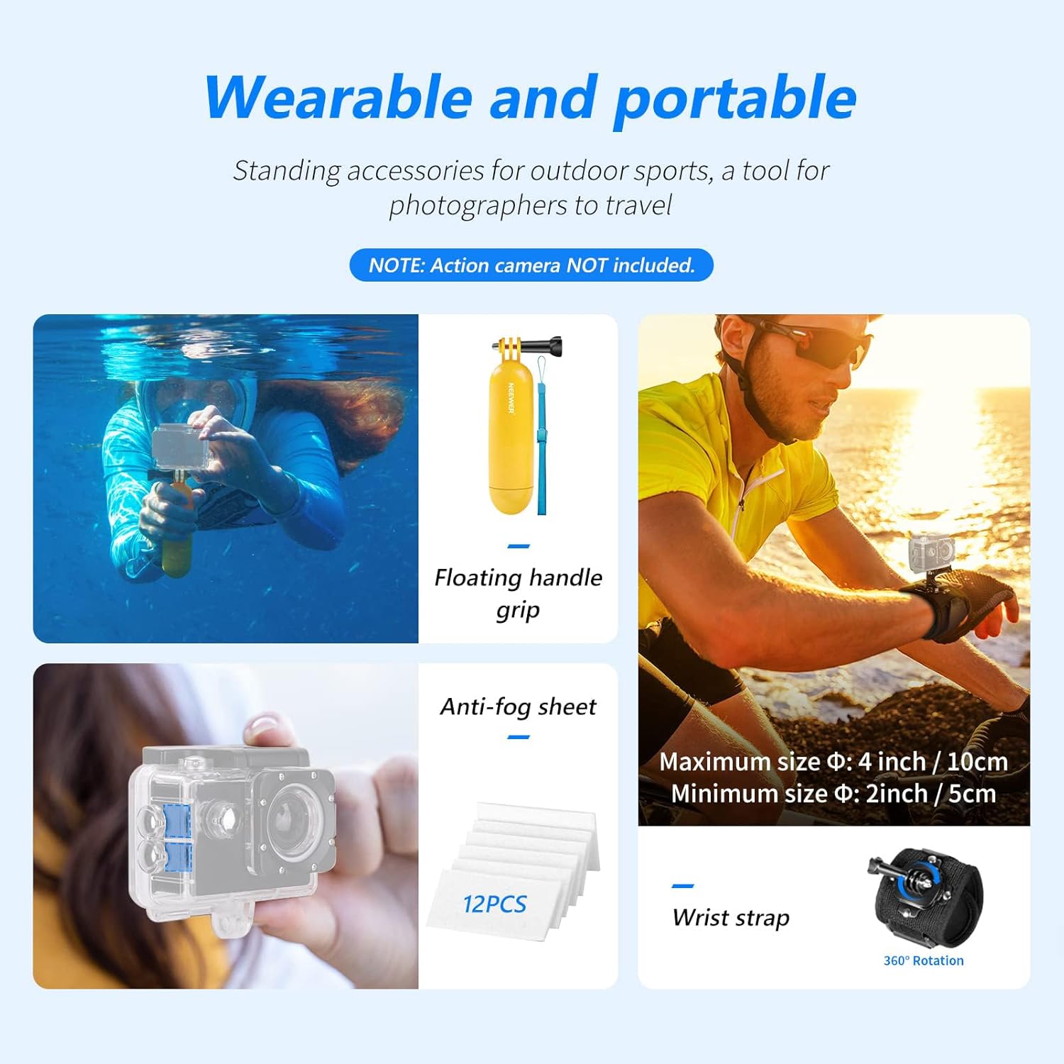 Wrist Strap & Floating Handle Grip: The wrist strap with a 360° rotatable mount is easily adaptable to fit your wrist and arm for taking shots from different angles. The floating handle grip keeps your camera afloat in the water when swimming or snorkeling