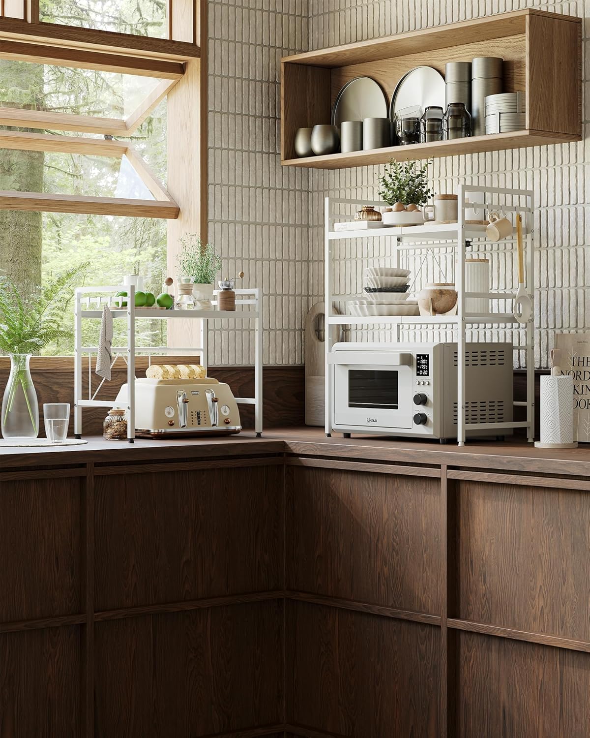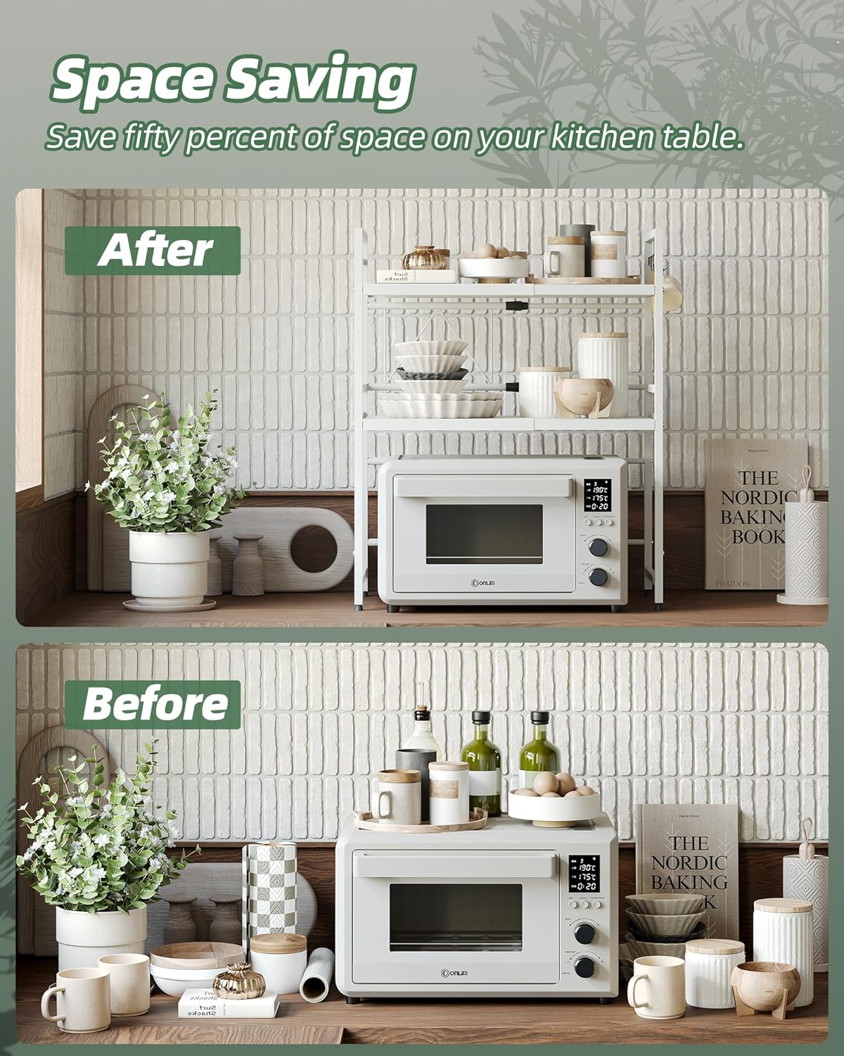 [Kitchen Shelf Organizer]: The kitchen shelf rack makes it convenient for you to store a microwave,stove, toaster, coffee machine, pot pans or other kitchen appliance, making your kitchen clean and tidy.