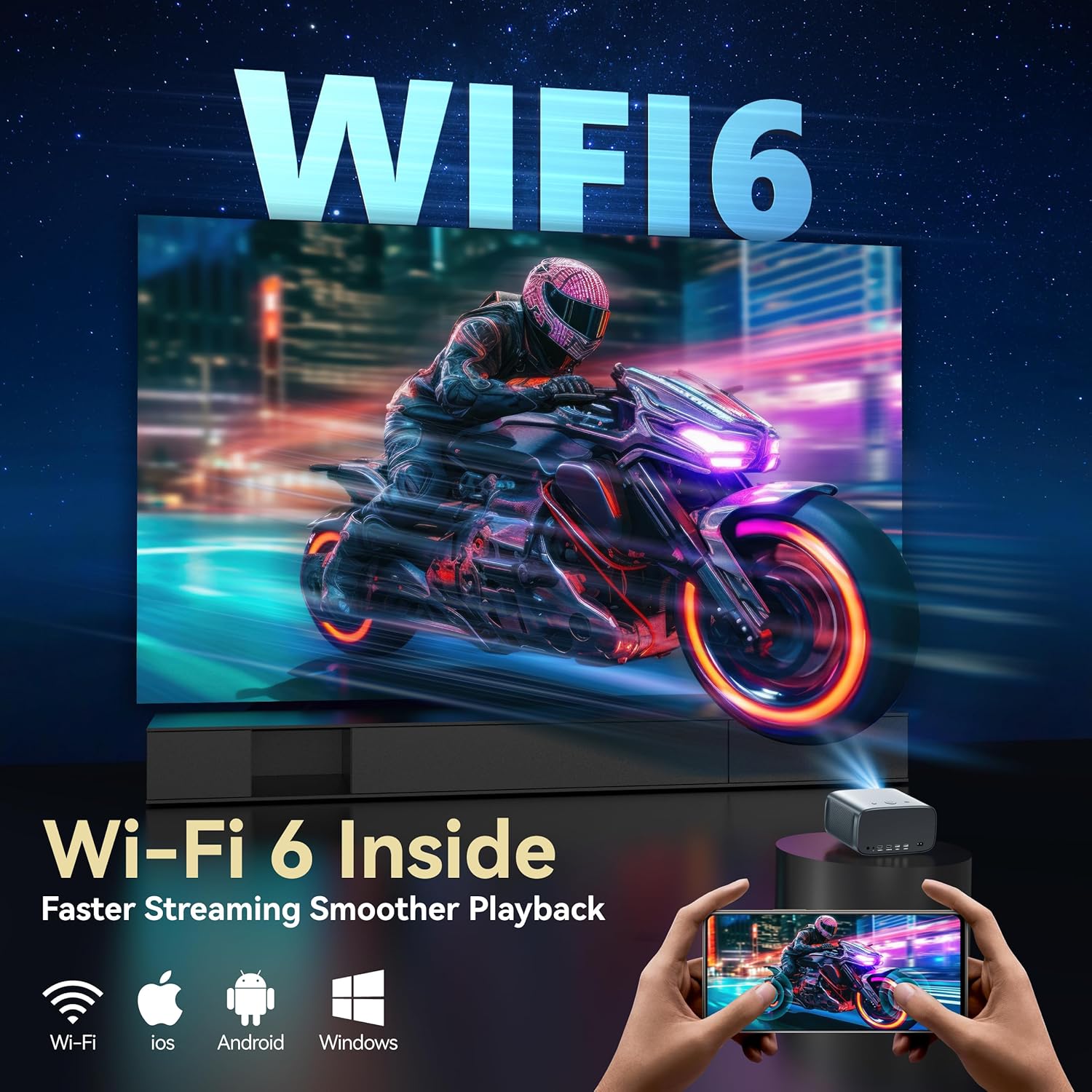 [No-Lag WiFi 6 & Dual-Mode Bluetooth] Stream seamlessly with WiFi 6 for ultra-fast, stable connectivity—no buffering, even during 4K movies or intense gaming. Two-Way Bluetooth 5.2 lets you play music through the projector as a speaker, or connect it to external Bluetooth speaker for bigger, theater-like sound during movie nights. Perfect for Christmas, Thanksgiving, or New Year’s celebrations—elevate every holiday moment with vibrant visuals and immersive audio.