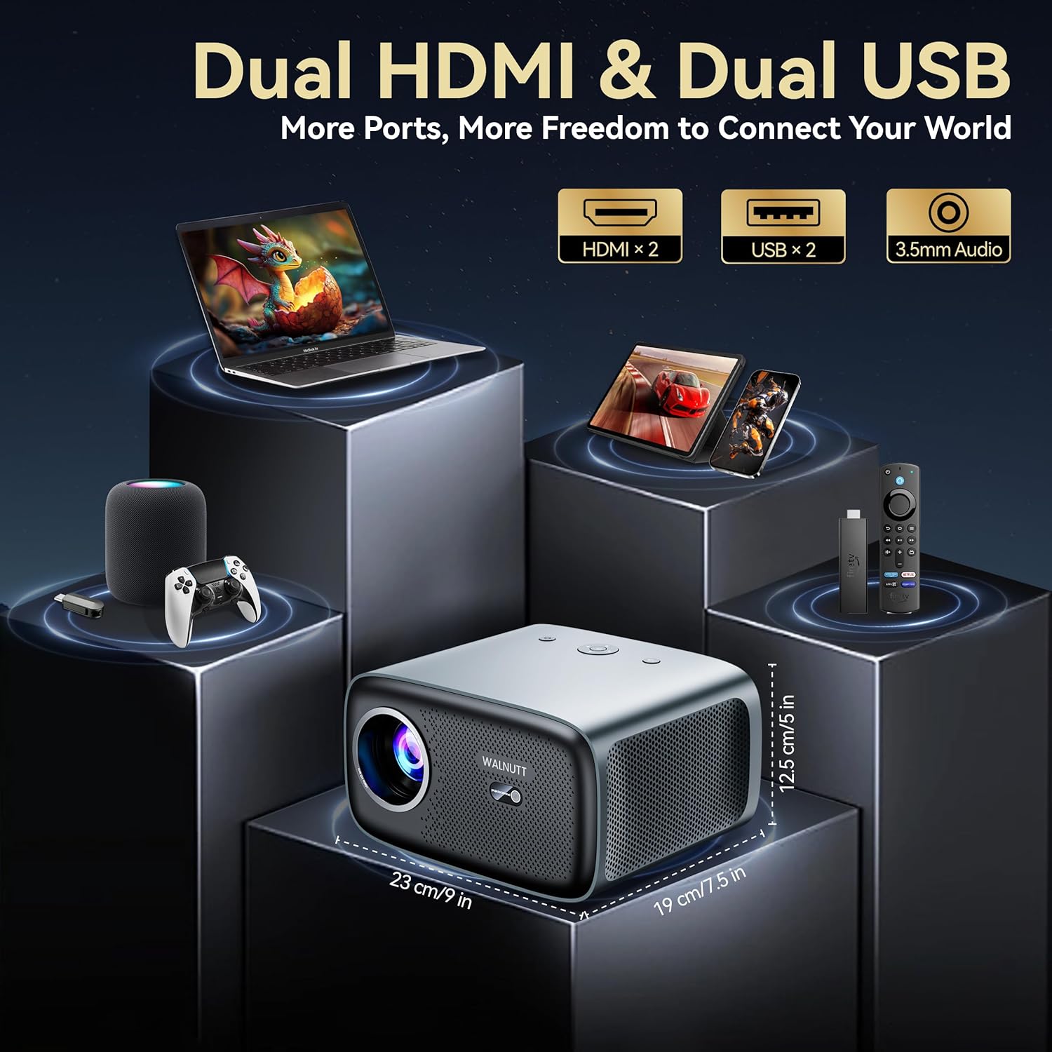 [Human-Centric Design] WALNUTT ceiling projector features built-in physical buttons for uninterrupted use—even if the remote is lost (we offer replacements), you can still operate it normally while waiting with no downtime; Dual HDMI and USB ports enable a multi-device hub, allowing simultaneous connections and seamless switching between work and entertainment; Operating below 36dB, it delivers ultra-quiet, immersive viewing for movies, meetings, or late-night use.