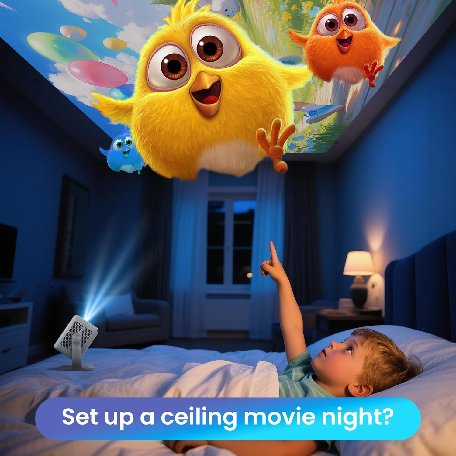 Wall/Ceiling Projecto — With a 360°rotatable stand, the outdoor projector effortlessly projects images onto the ceiling for an unparalleled viewing experience. Whether you prefer to sit or lie down to watch your movies, it satisfies everyone. This wifi projector with apps also supports floor stand, ceiling mount and table mount, home projector wherever, whenever.(with a 1/4” screw hole at the bottom)