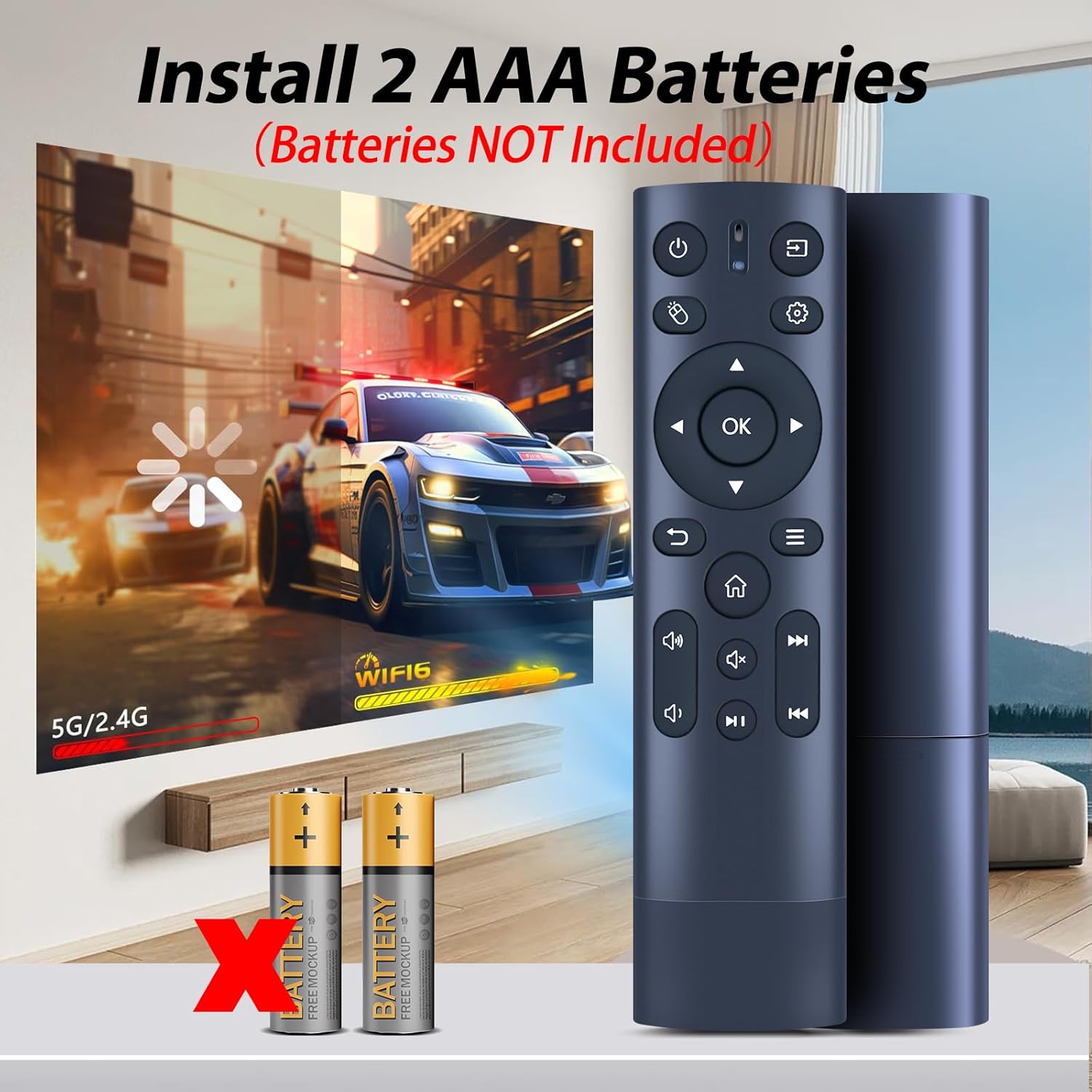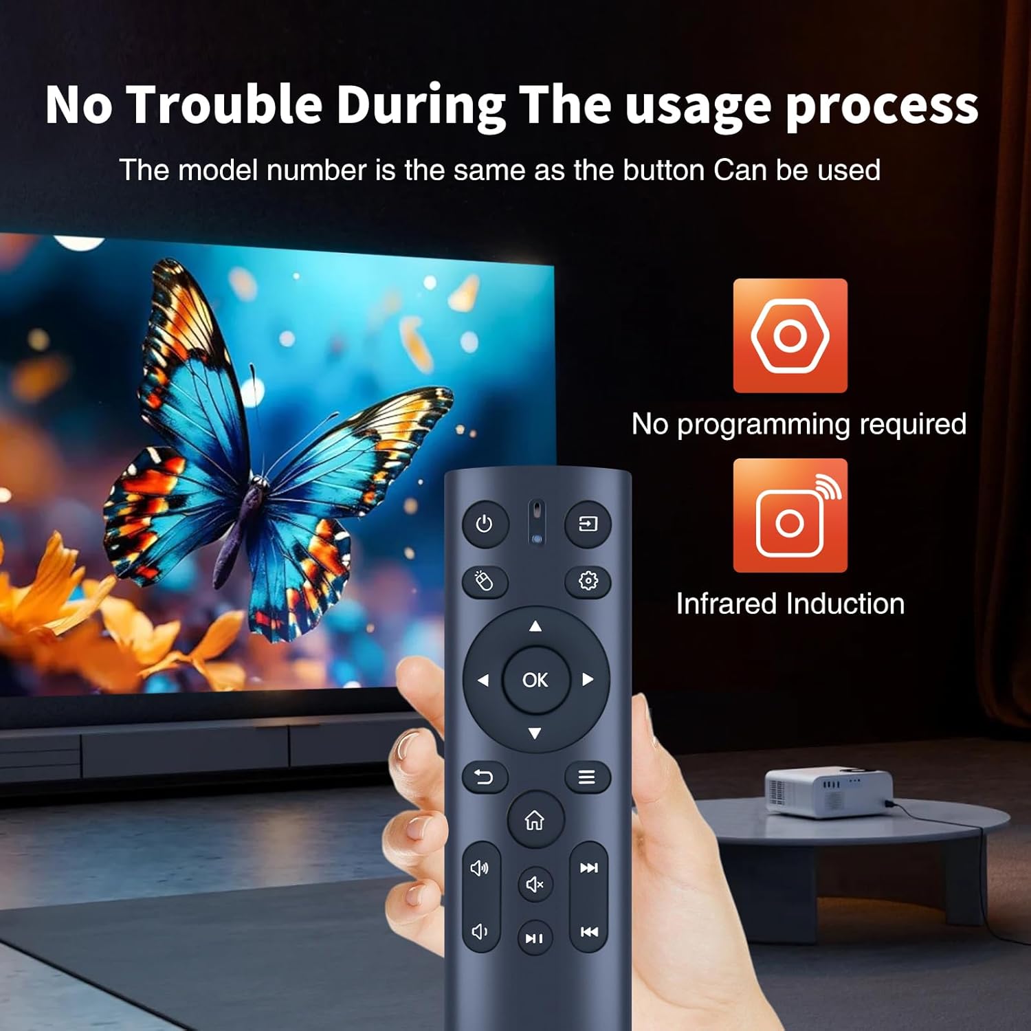 【Two Pairing Methods】1、There are infrared (IR) sensors at the front center of the projector and on the remote. If you choose to use this method to control the projector, it has a maximum range of 26 feet. 2、 Ensure that the remote is within a few feet of the front of the projector before pairing. Press and hold the Return and Menu buttons simultaneously for at least 10s. If the pairing is successful, the screen will show “Remote connected”.