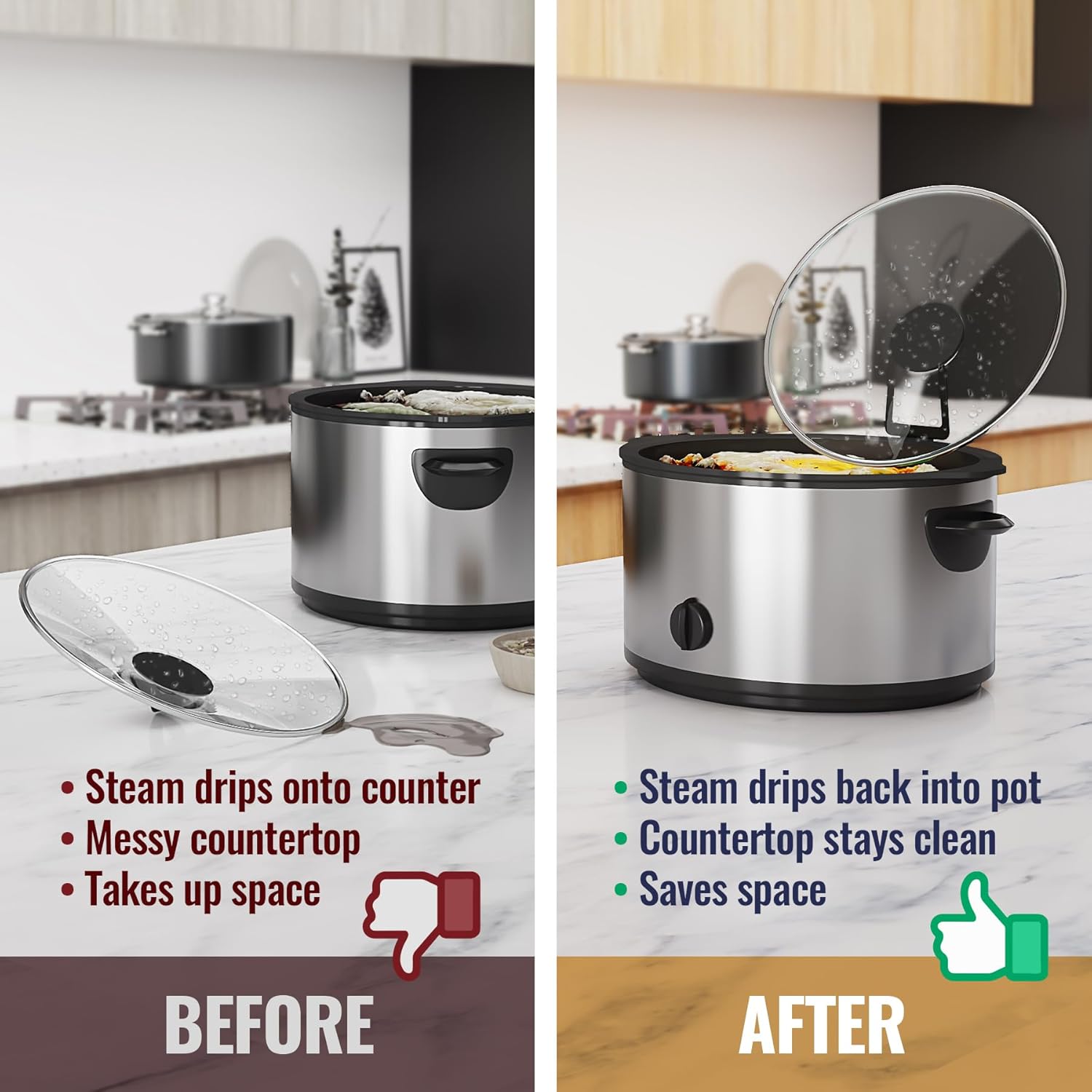 Kitchen Helper: Allows you to place the lid while cooking, preventing water stains on countertops and freeing your hands to improve cooking efficiency.
