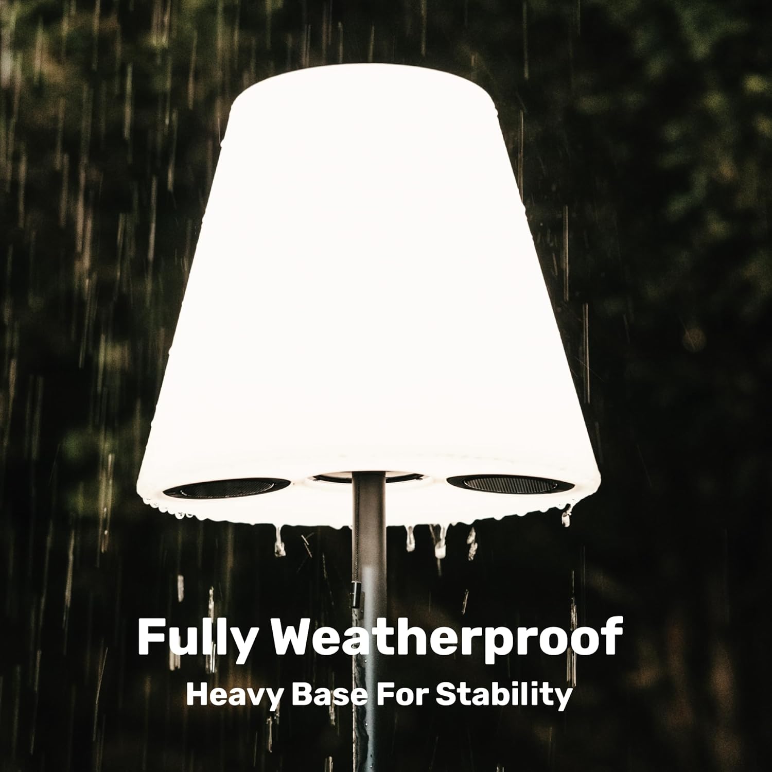 This outdoor floor lamp with Bluetooth speaker is designed to transform your deck or patio. It fills the space with a warm, diffuse light that illuminates a large area without glare. Play music with the built-in Bluetooth speaker from any device. It is 100% powered by the sun. Solar panels on the top charge the batteries during the day so you never have to plug it in. Weatherproof, it is designed to be left outside permanently. The heavy base keeps the lamp upright and standing even during a storm.