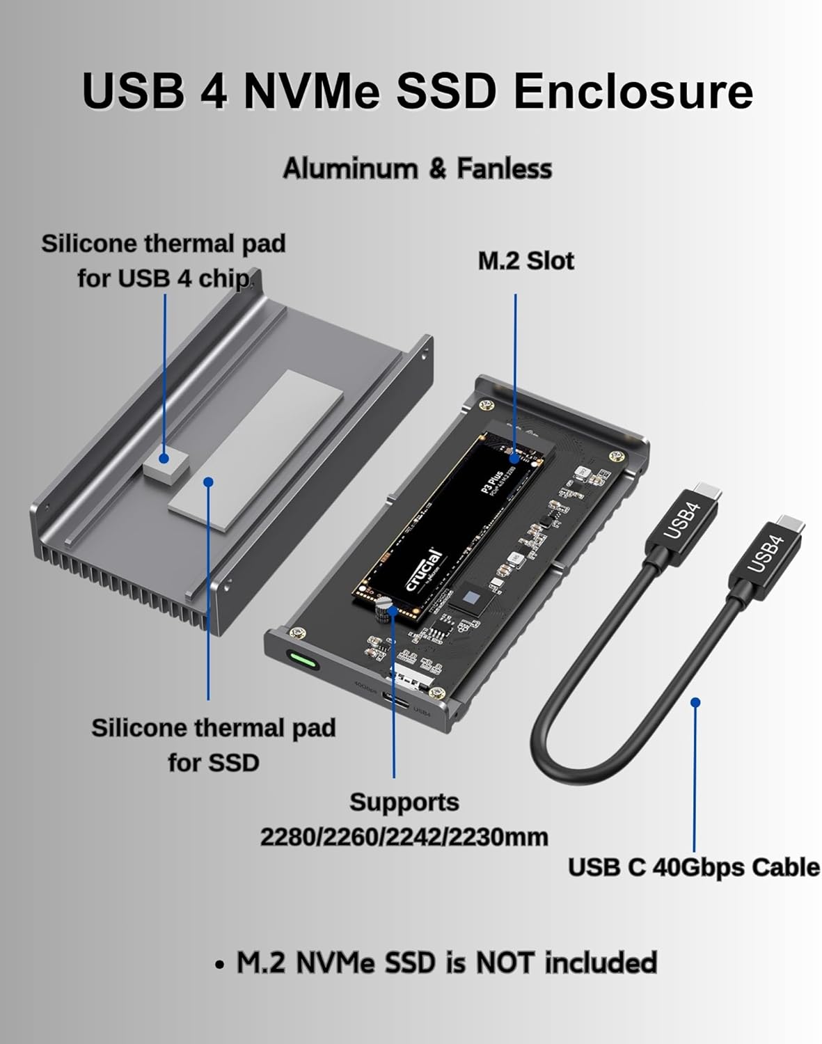 What’s In The Box: The package includes USB 4 enlosure, coacial USB-C cable (40Gbps), velvet drawstring gift bag, quick start guide, silicone thermal pads, screw driver and screws. This product does not include any SSD, you need to buy and install the SSD by yourself.
