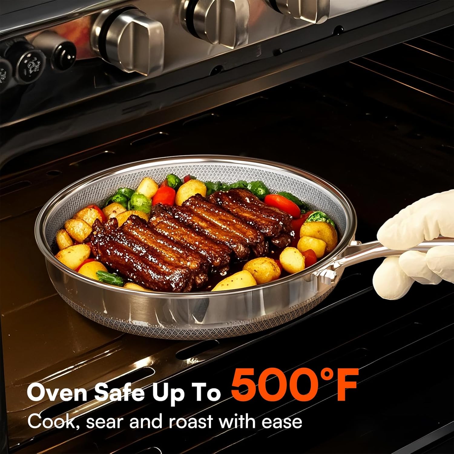 Superior Durability:KURRUNGIE Nonstick Frying Pans use five construction, with aluminum between stainless steel layers for quick, even heating and easy food release. stainless steel pan The hollow handle stays cool to prevent stovetop overheating.