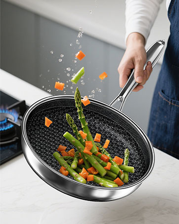 Snow Flake Technology: Our design is created through a laser etching process to provide both stainless steel and non stick surface. This dual surface allows to cook with less oil, grease, and butter. non stick frying pans ensuring your daily cooking is always safer and healthier.