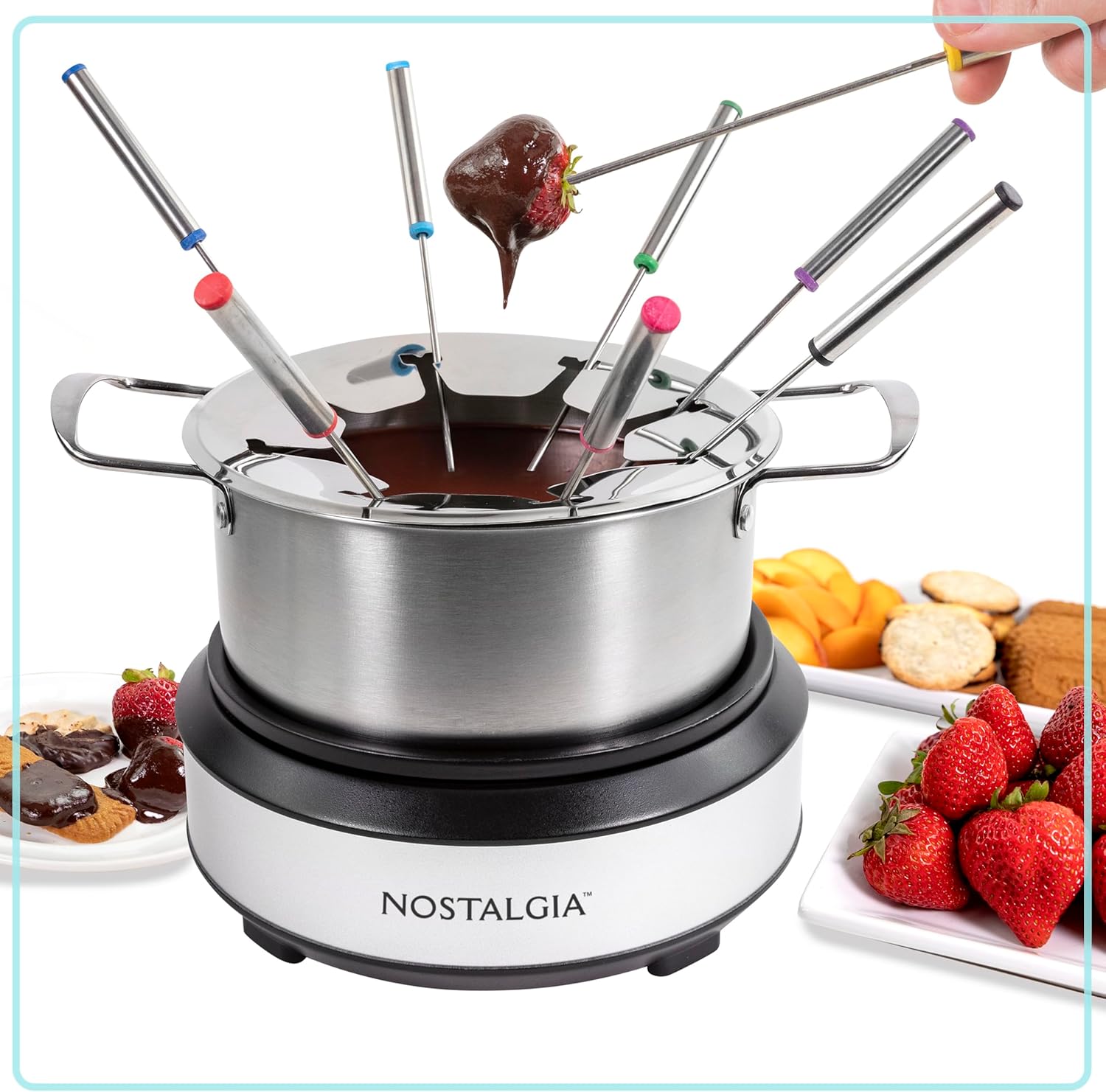 The Nostalgia 8-Cup Electric Fondue Pot Set can elevate your dining experience and create unforgettable memories with friends and family. With this versatile fondue set, you can make a wide range of delicious treats, from savory cheese fondues to mouthwatering chocolate desserts. It features an adjustable temperature control, allowing you to achieve the perfect consistency for your cheese or chocolate fondue. With its sleek design and easy-to-use features, this fondue pot is a must-have for every home. Whether you’re hosting a romantic date night or a lively party, the Nostalgia 8-Cup Electric Fondue Pot Set is ideal for creating a fun and interactive dining experience. With this versatile fondue set, you can make a wide range of delicious treats, from savory cheese fondues to mouthwatering chocolate desserts. It features a simplified temperature dial, allowing you to achieve the perfect consistency for your cheese or chocolate fondue. With its sleek design and easy-to-use features, this fondue pot is a must-have for every home. It is an all-in-one deluxe party set, featuring a 2.5-cup chocolate melting pot, 4 dipping forks, and a 3-section food and fruit tray. You can elevate any party, celebration, date night, and more with this versatile gadget. It also makes a perfect gift for any chocolate lover or hors d’oeuvre connoisseur! Whether you’re hosting a romantic date night or a lively party, the Nostalgia 10-Oz Electric Fondue Pot Set is ideal for creating a fun and interactive dining experience.