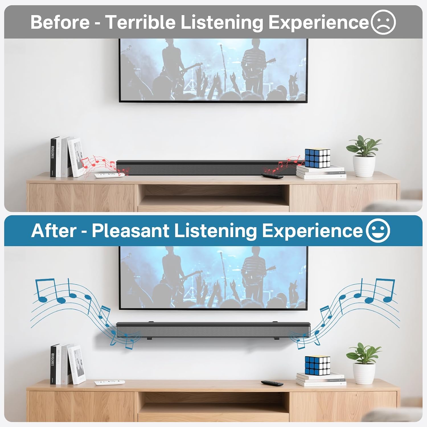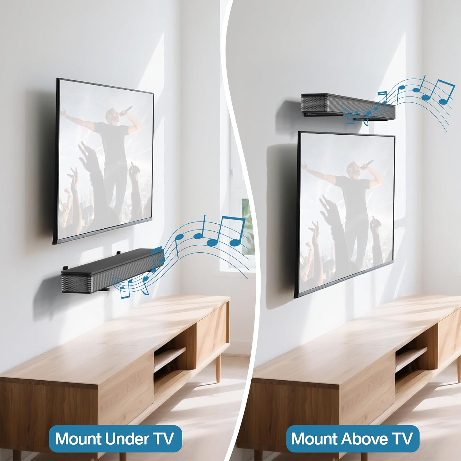 Space Saving: With our soundbar mount bracket, you can free up valuable tabletop space by mounting your soundbar on the wall above or below your TV. This sleek and organized setup allows you to enjoy your music in the most comfortable way possible.