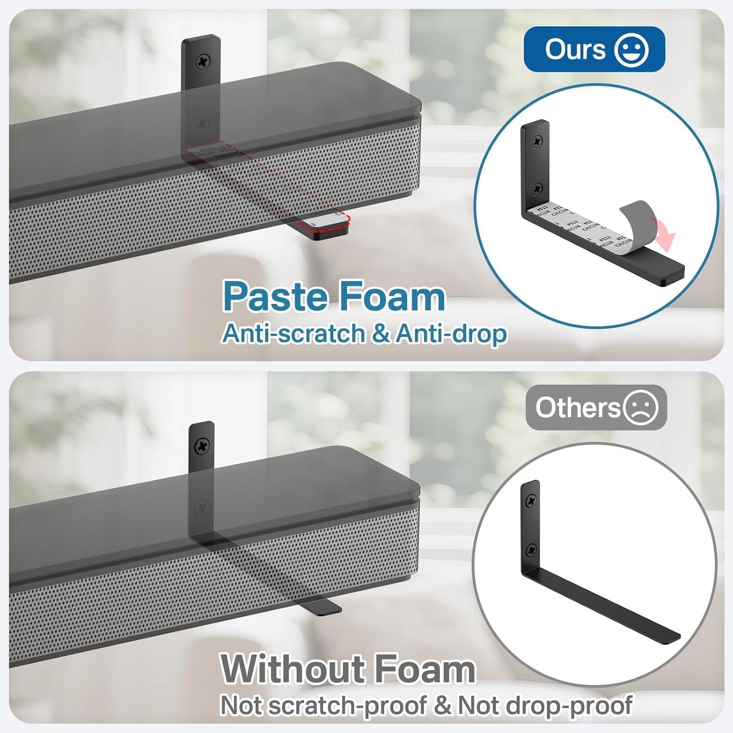 Anti-slip & Hold Firmly: Our soundbar shelf is designed with soft pads to prevent your soundbar from slipping or scratching, ensuring a firm and secure hold. With strong adhesive and a sturdy design, this wall mount bracket provides worry-free entertainment for you and your family.