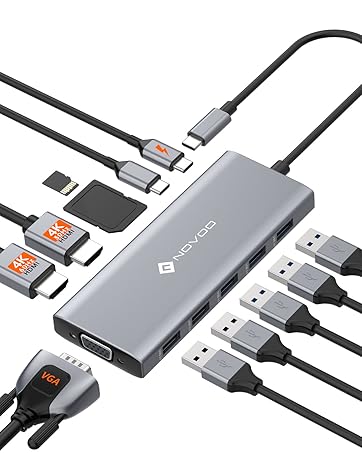 15 in 1 USB C Docking Station: NOVOO USB C HDMI Multi-Port hub with Screen Switch, Dual 4K HDMI Ports, 2*USB-C 3.0 Data Ports (Up to 5Gbps), 1*USB C PD100W charging port, 3*USB-A 3.0 Ports, 2*USB-A 2.0 Ports, Gigabit RJ45 Ethernet, VGA, SD/Micro SD Card Reader and 3.5mm Audio/Mic Port. Plug and play for your many needs.