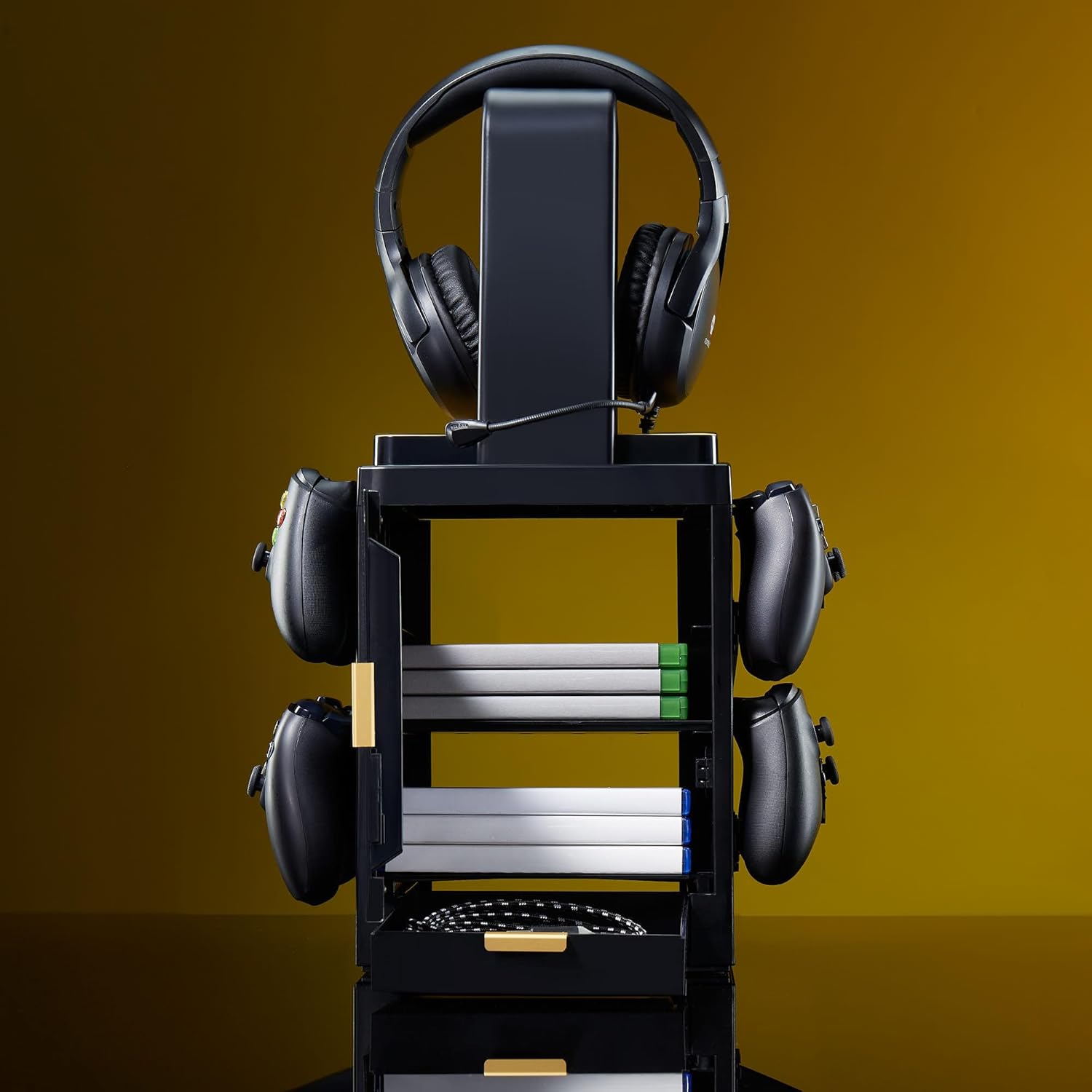 Stores up to 10 games or movies, hangs up to 4 controllers and securely holds headphones on top; integrated device tray offers a convenient space to hold extra accessories & cables