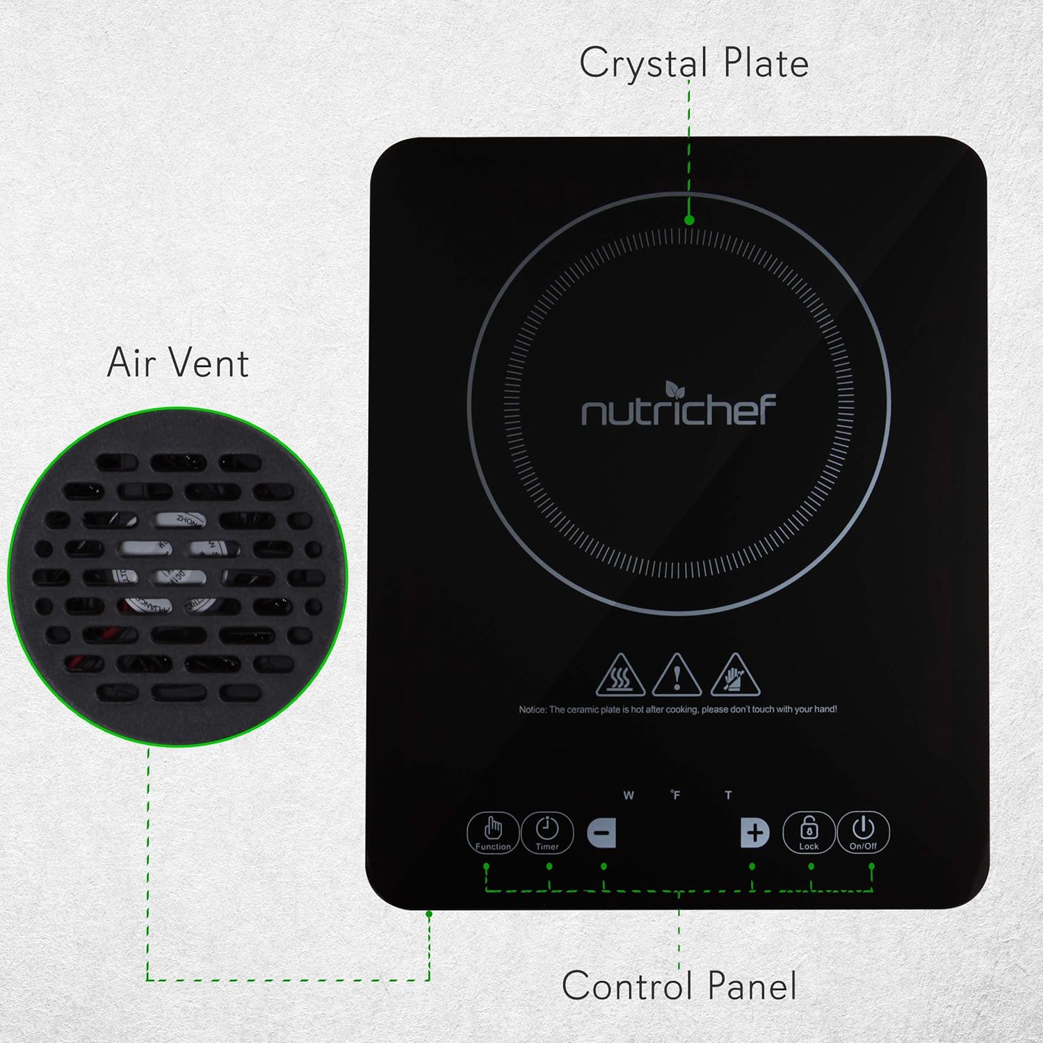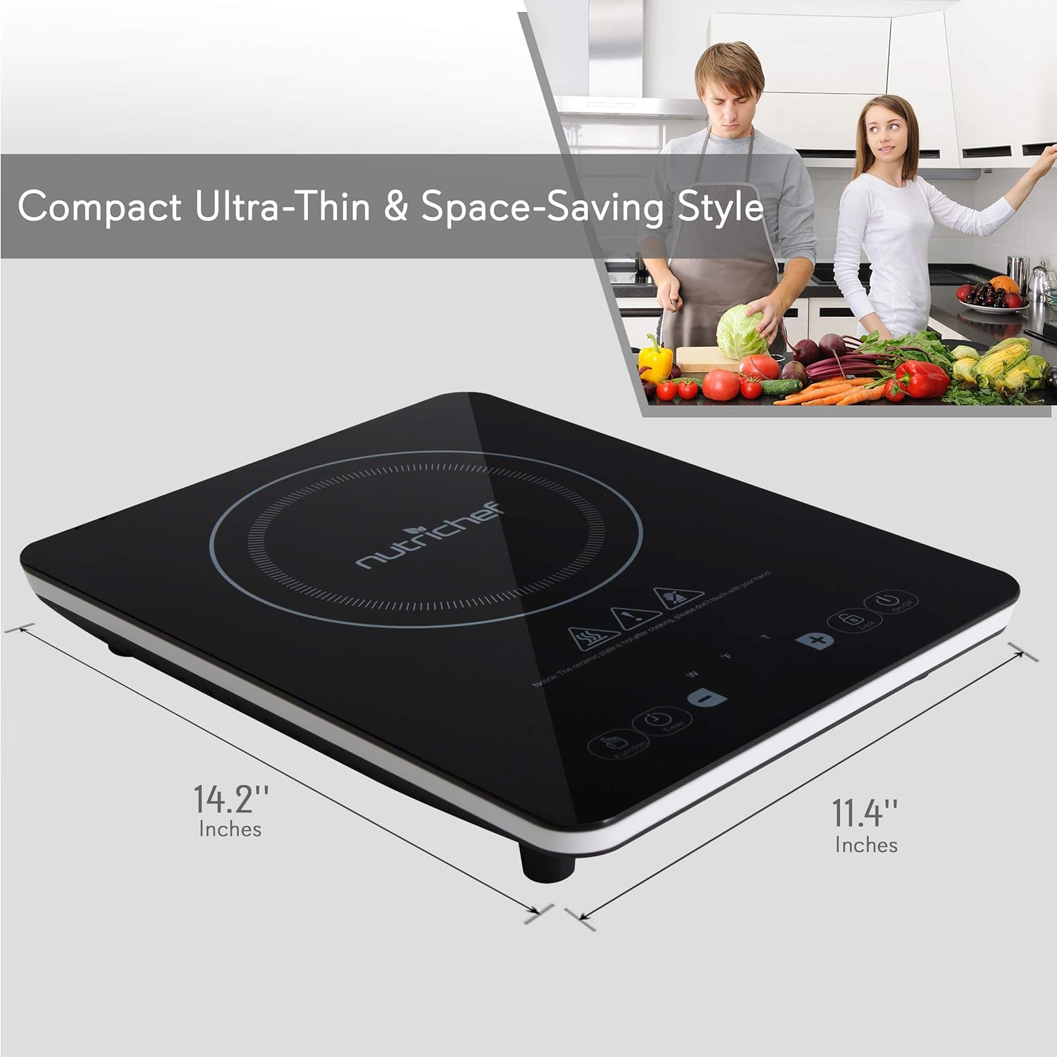 The NutriChef Induction Cooktop – Digital Countertop Burner with Adjustable Temp Control – Ceramic Tempered Glass Induction Cooktop – Simple Electric Plug-in Flameless Burner Design – High-Powered Heating Element – Circular Top Panel Heating Zone – Quickly Heats for Instant Food Prep – Digital LCD Display Screen – Sensor Touch Controls – Countdown Timer Setting – Adjustable Temperature Setting – Built-in Child Safety Lock – Stain-Resistant & Easy-to-Clean – Compact Ultra-Thin & Space-Saving Style – Built-in Turbo Fan for Quicker System Cool-Down – Energy Efficient: Low Power Consumption – Safety Certified & Approved.