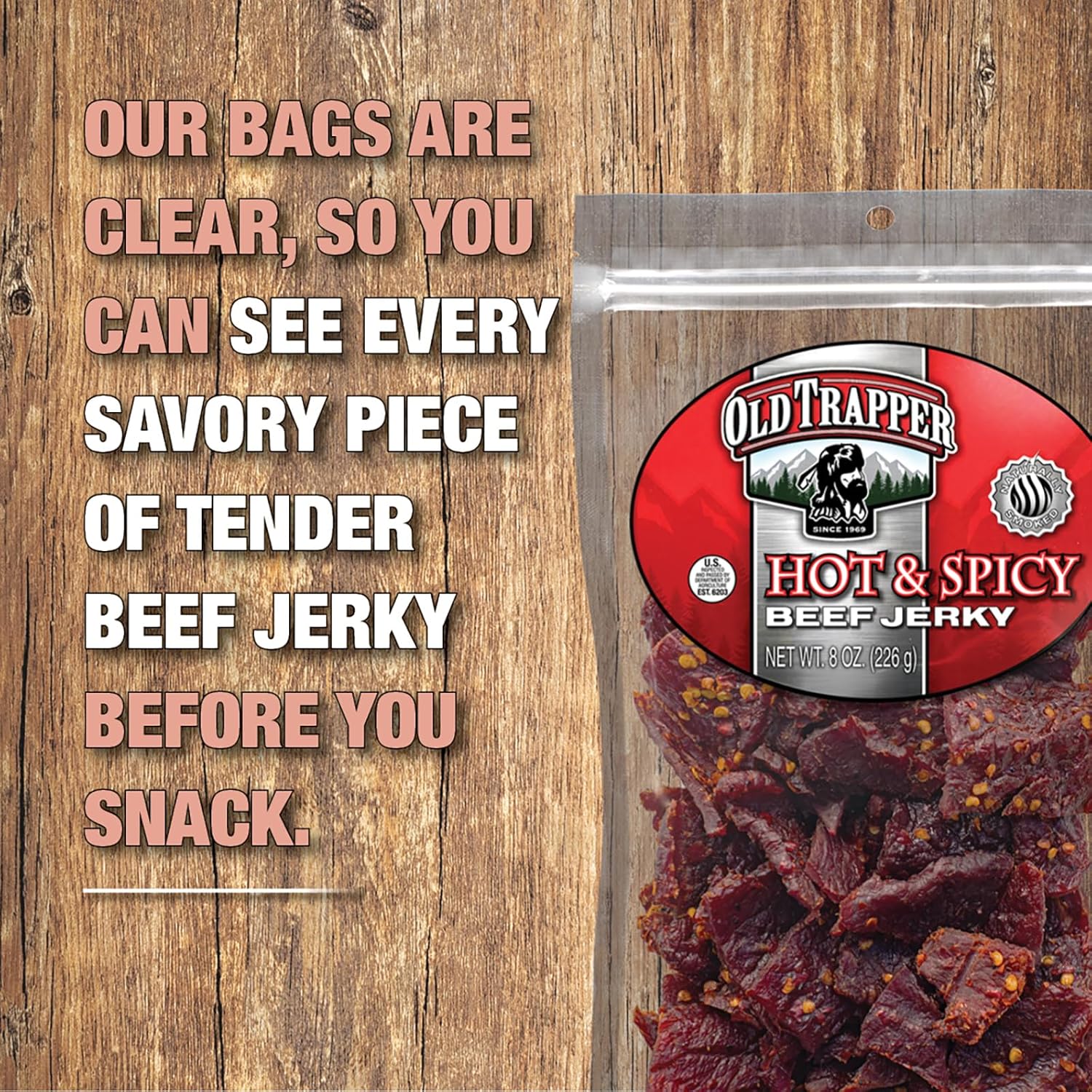 Old Trapper Hot & Spicy Beef Jerky brings serious heat to your snacking routine. We take our signature wood-smoked beef jerky and add generous amounts of spicy red pepper flakes for a fiery kick that spice enthusiasts will love. This eight-ounce bag gives you plenty of protein-packed, flavorful jerky to satisfy your hunger while bringing the heat.
