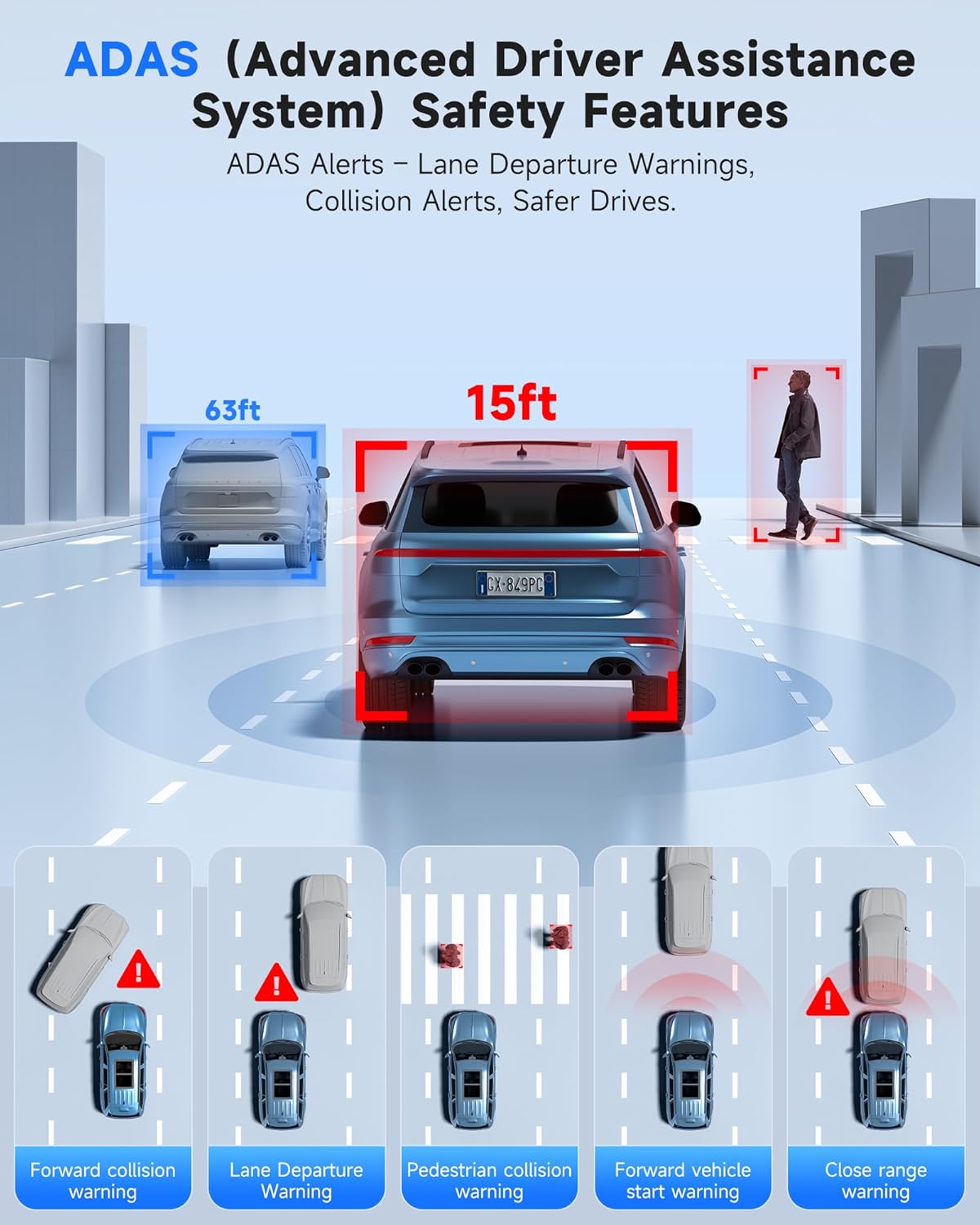 Smart ADAS Collision Prevention System: This advanced dash cam actively helps avoid accidents with real-time alerts for forward collisions, pedestrians, and lane departures. The intelligent system monitors following distance and notifies you when traffic ahead moves. Visual and audible warnings keep you aware of potential hazards, while the AI-powered analysis works continuously to assess risks. These safety features make it like having a co-pilot watching the road with you