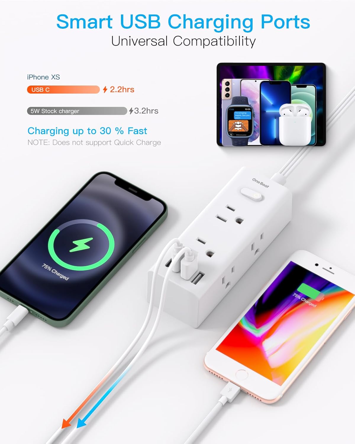 【10-in-1 Extension Cord with Multiple Outlets】Flat power strip could turn 1 sockets into 6 AC outlets 2 USB-A and 2 USB-C, which could charge up to 10 devices at the same time. The USB C port can charge up to 5V/3A. 2 USB-A ports can charge up to 5V/2.4A Max, all USB Ports Output is 5V/3.1A, compatible with your cellphone, laptop, tablet, earphone or cameras without a variety of converters.