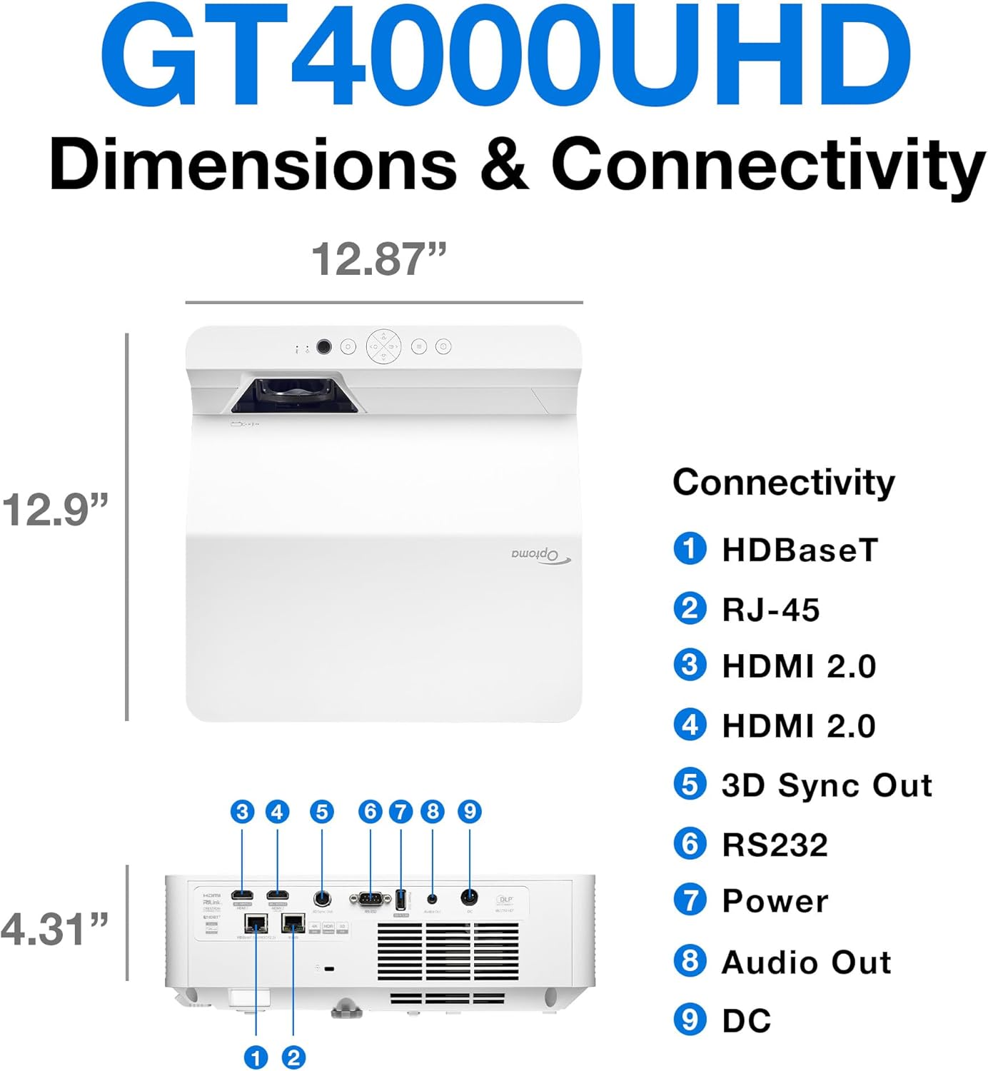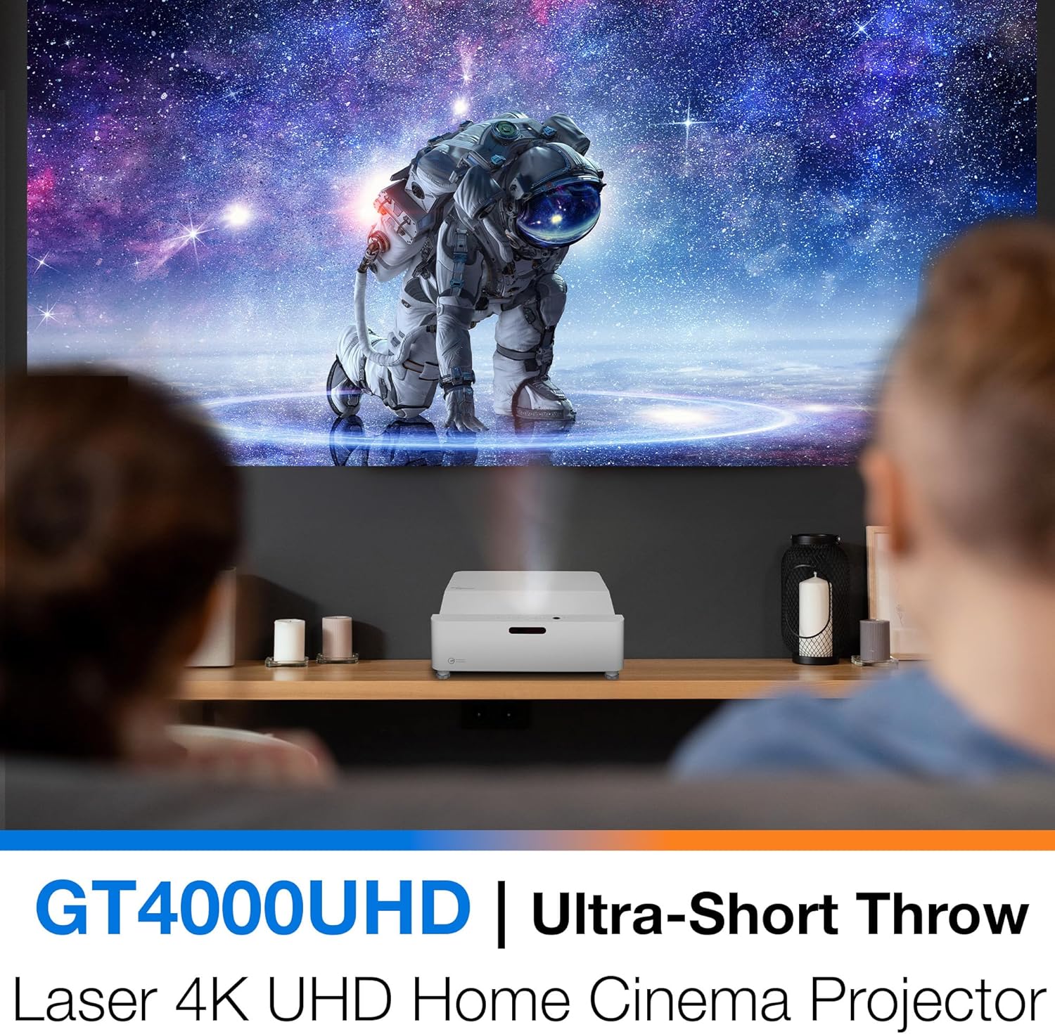 The GT4000UHD is a compact 4K UHD Ultra Short Throw projector boasting a high brightness of 4,000 lumens. GT4000UHD is engineered to deliver cutting edge 4K UHD visuals for Console Gaming, PC Gaming, and Home Entertainment (such as Streaming Video Content from popular streaming services).