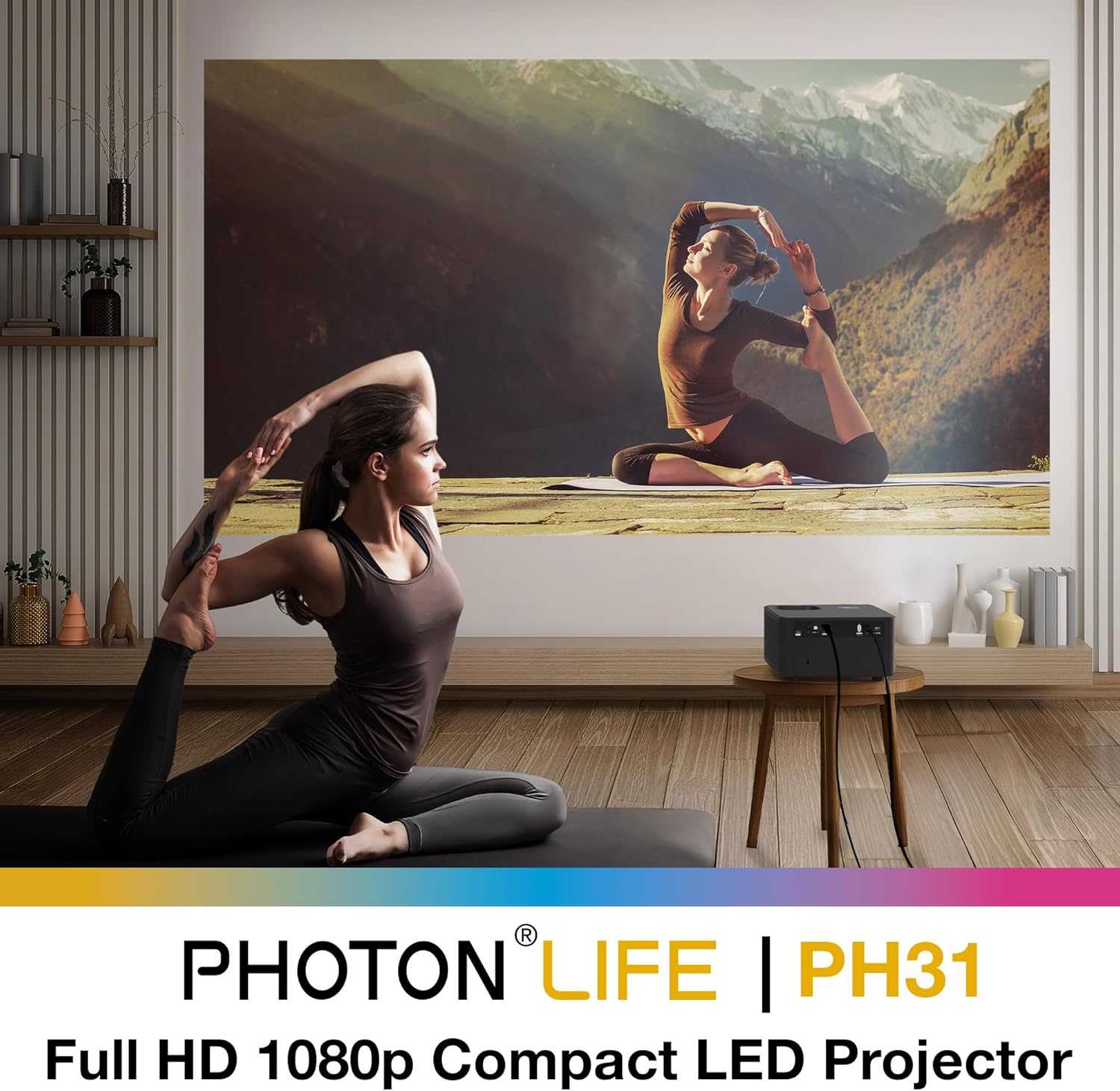 Photon Life PH31 delivers cinematic 1080p – Streaming and Gaming anywhere. Powered by RGB LED technology, 1500 lumens, super-sized 150 inch image, 100% 95% DCI-P3 color gamut coverage. Whether using PH31 in the living, bedroom, backyard, dorm room, or on the go – setup is effortless with features like Auto Keystone and 1.1x Zoom