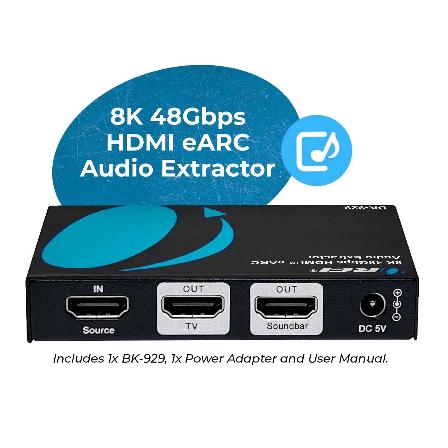 OREI BK-929 8K Extract eARC Audio from your external source to HDMI to eARC (Dolby Atmos) Compatible Soundbar – Auto eARC detection when using the TV’s App or external devices. 8K @ 60hz 4:2:0 12bit, Ultra HD Support – HDMI 2.1 (48Gbps FRL * 18Gbps TMDS Video Bandwith), HDCP 2.3 compliant, supports resolutions up to 4K @ 120Hz, 50/60Hz (YUV 4:4:4) HDR, DVI Compliant. VRR, ALLM, QMS, QFT, SBTM Support, HDR/10/10+, DOlby Vision and HLG Pass Through. Audio Extractor: Extract full HDMI audio from any HDMI source signal and pass-through 4K or HDR the video to a compatible display/TV and output HDMI Audio to AV Receiver with HDMI input., LPCM 7.1 CH, Dolby TrueHD, Atmos and DTS-HD Master, DTS: X Audio Pass-through. Supports – DTS HD, Dolby TrueHD (via HDMI), Dolby Atmos Compatible, Supports CEC ( Use the TV RC to Adjust the Soundbar Volume and CEC Connecting device power on/off)