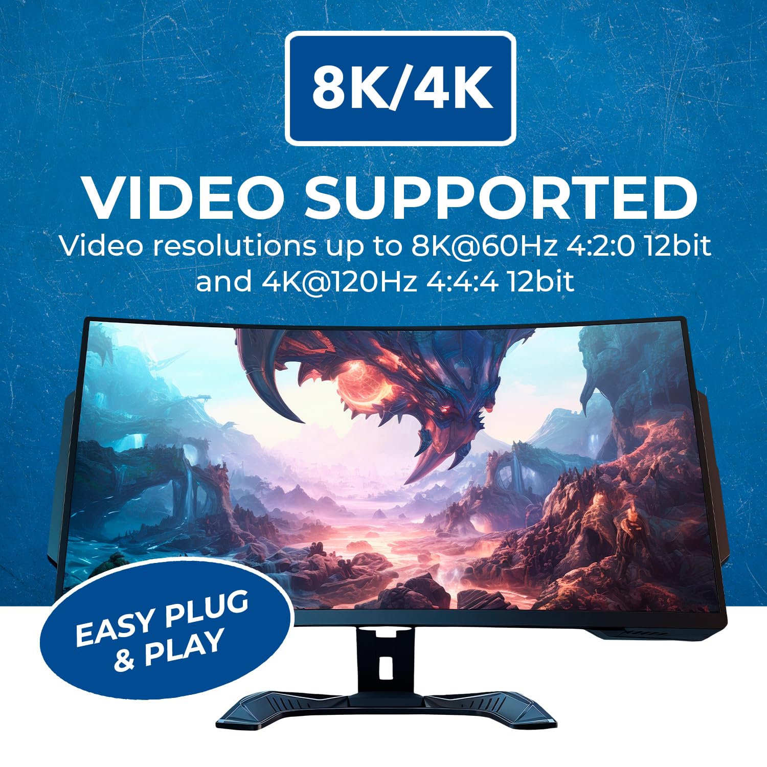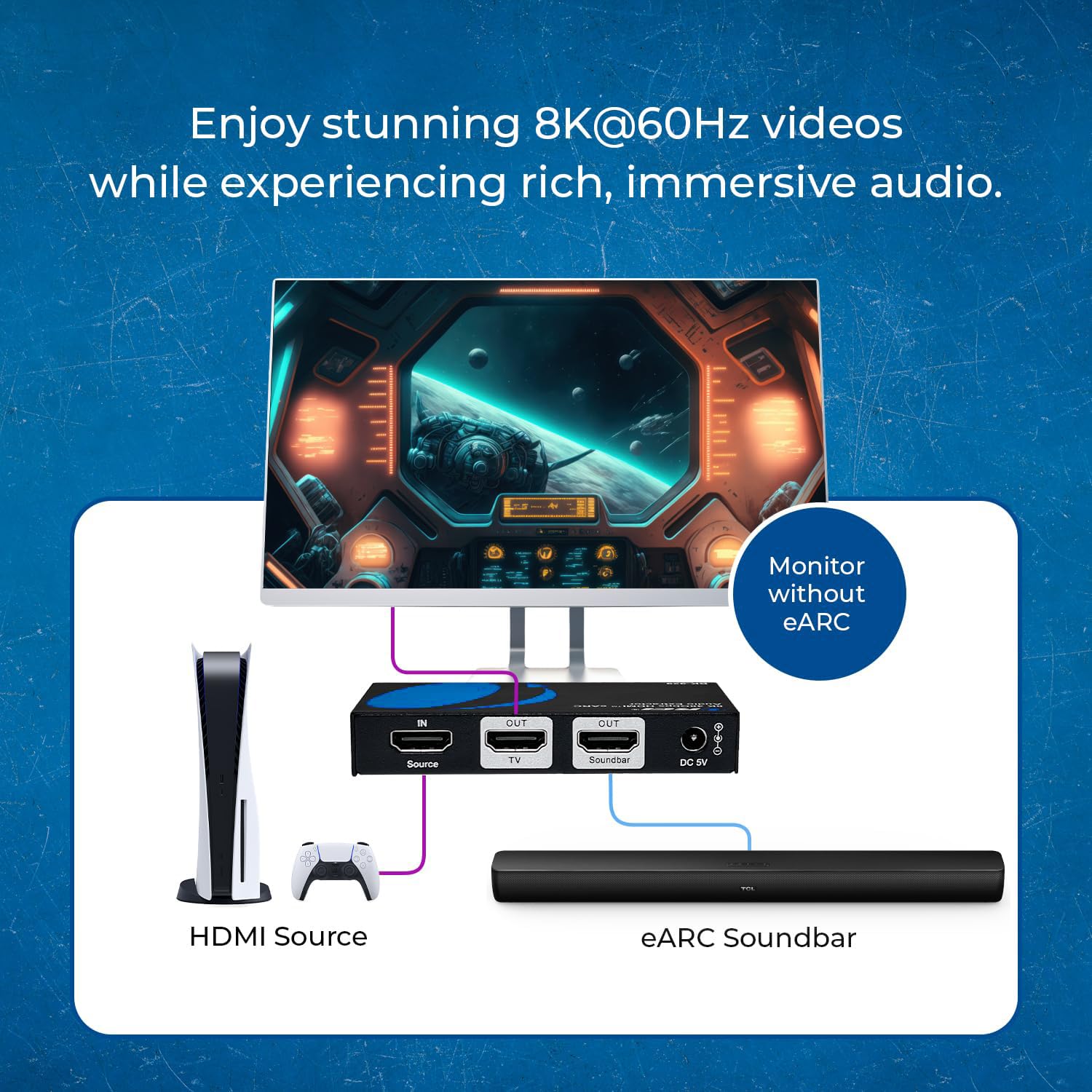 Extract eARC audio from your external source such as Apple TV and Send to a soundbar. Perfect for 8K Monitors for Gaming. Perfect for playing 4K@120hz, 2K@60hz PS5 or Xbox games on a 120hz 4K monitor while extracting eARC audio to your soundbar