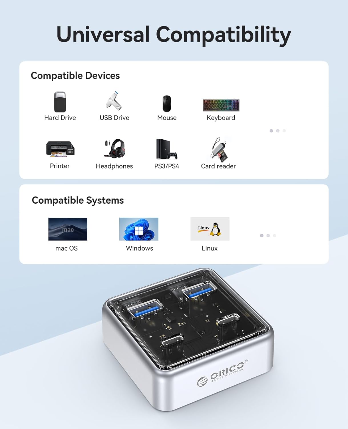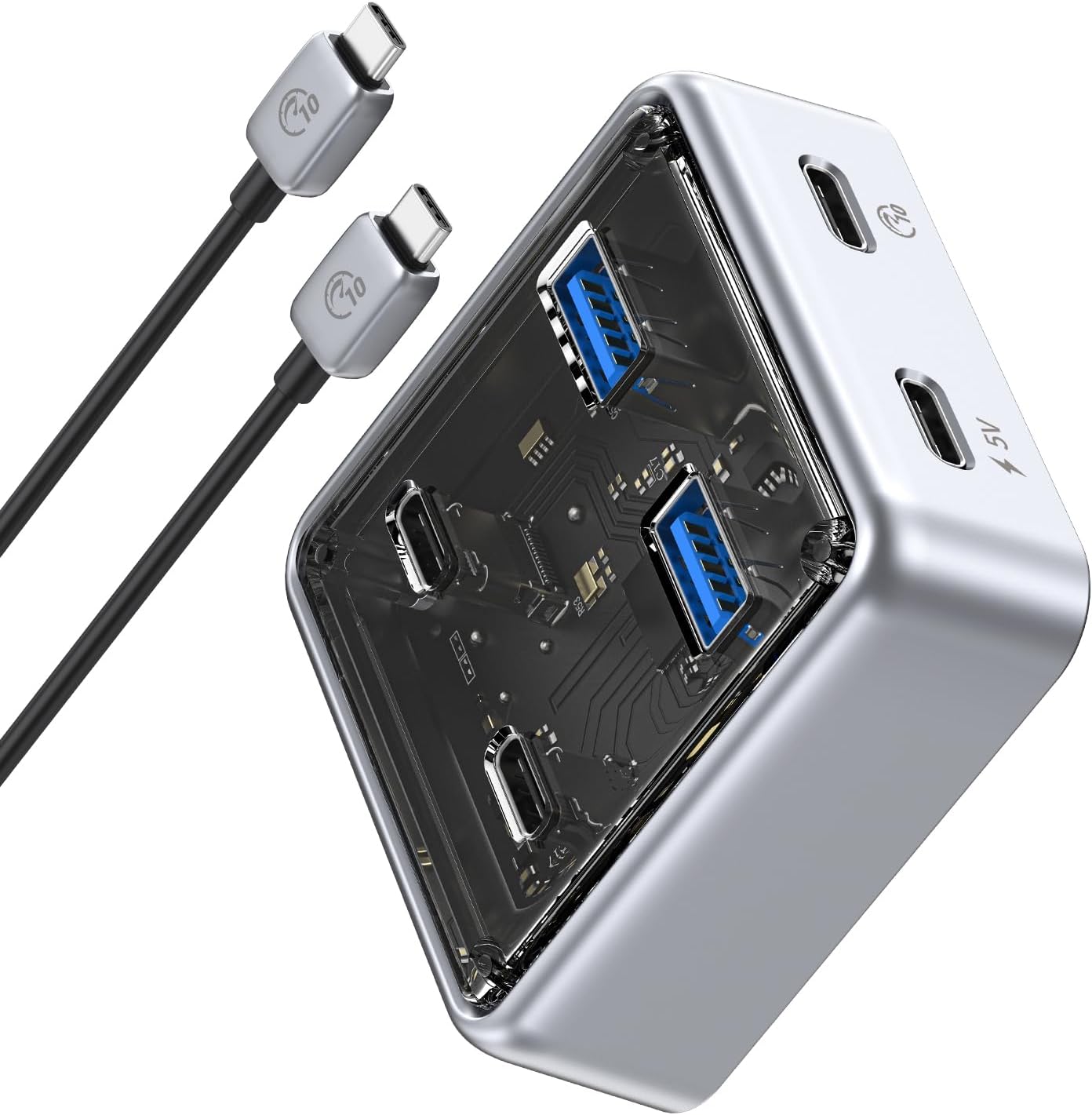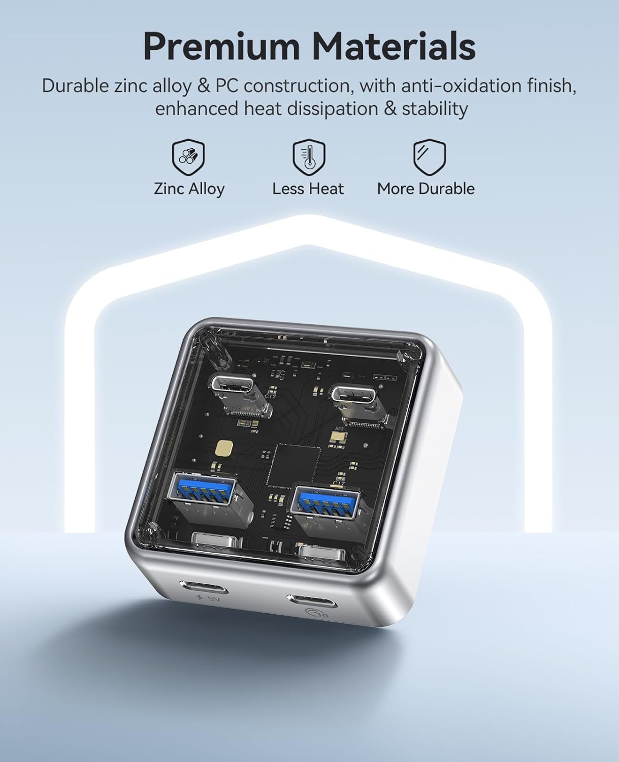 Sleek & Durable Design: This multi-port hub combines zinc alloy and transparent PC material, featuring an elegant, modern look with a technological flair. The zinc alloy undergoes anti-oxidation treatment, ensuring it is both visually appealing and highly durable, standing the test of time.