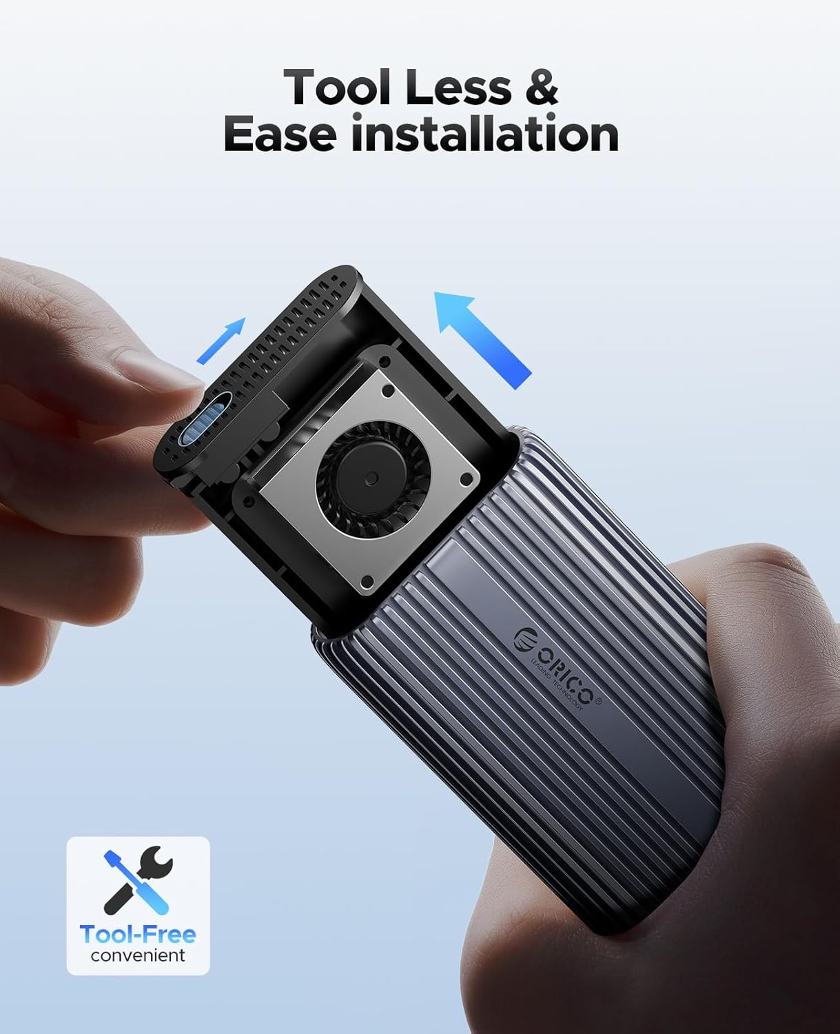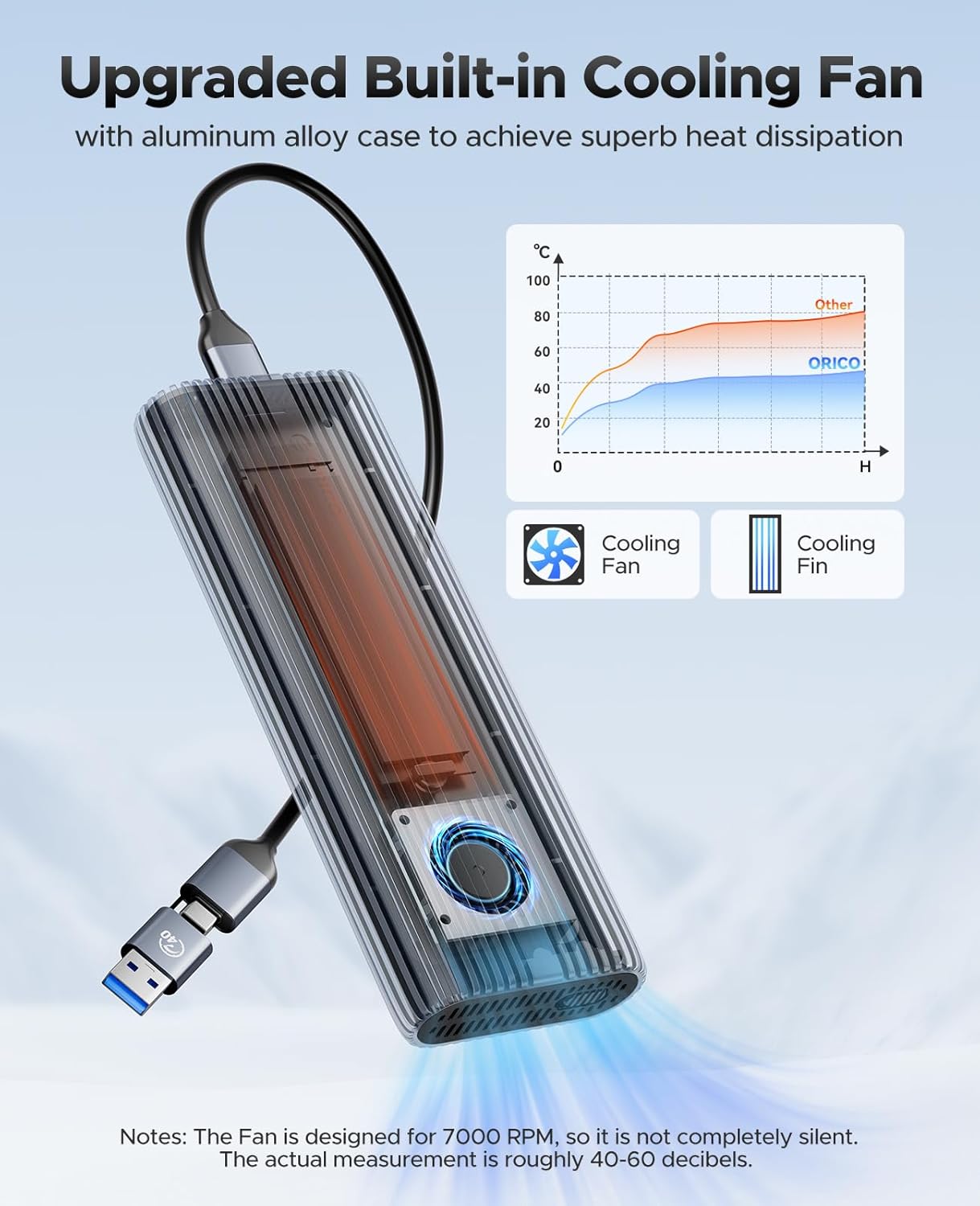 Efficient Heat Dissipation: Designed with an aluminum alloy body featuring a 360° stripe pattern, built-in fan, cooling silicone pad, and metal vest for enhanced airflow. This setup effectively keeps your SSD cool, preventing speed drops, disconnections, data loss, and potential damage