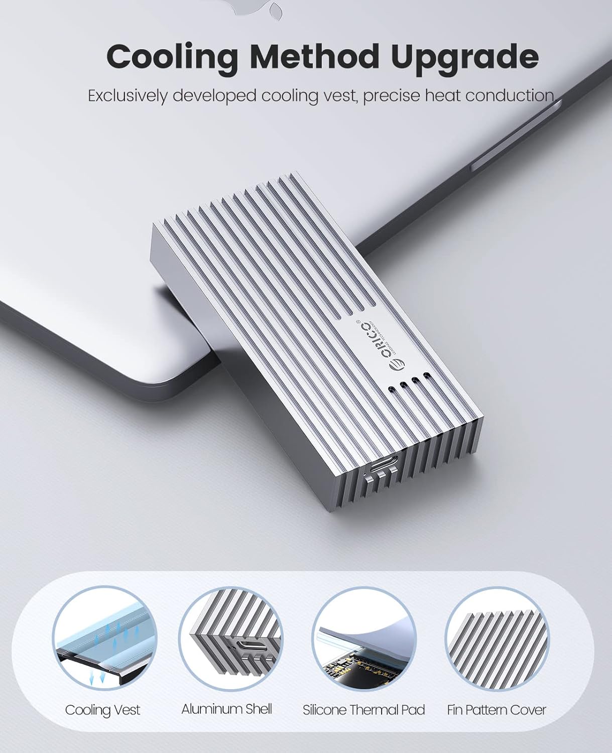 【Cooling Vest】 The NVMe case is professionally designed by ORICO, adding aluminum alloy cooling vest, with silicone thermal pad and striped aluminum alloy shell (striped shape can increase the heat dissipation area), to quickly release the high temperature generated by the NVMe SSD during the working process. And high-strength shock-resistant drop