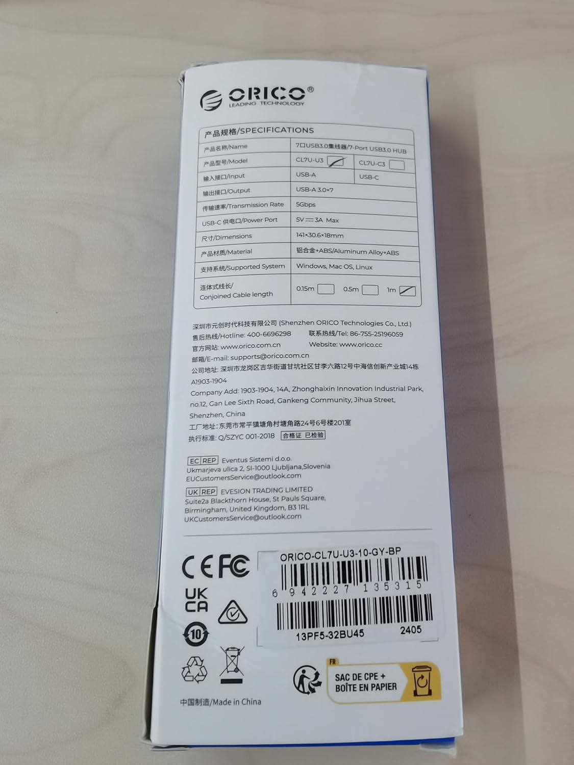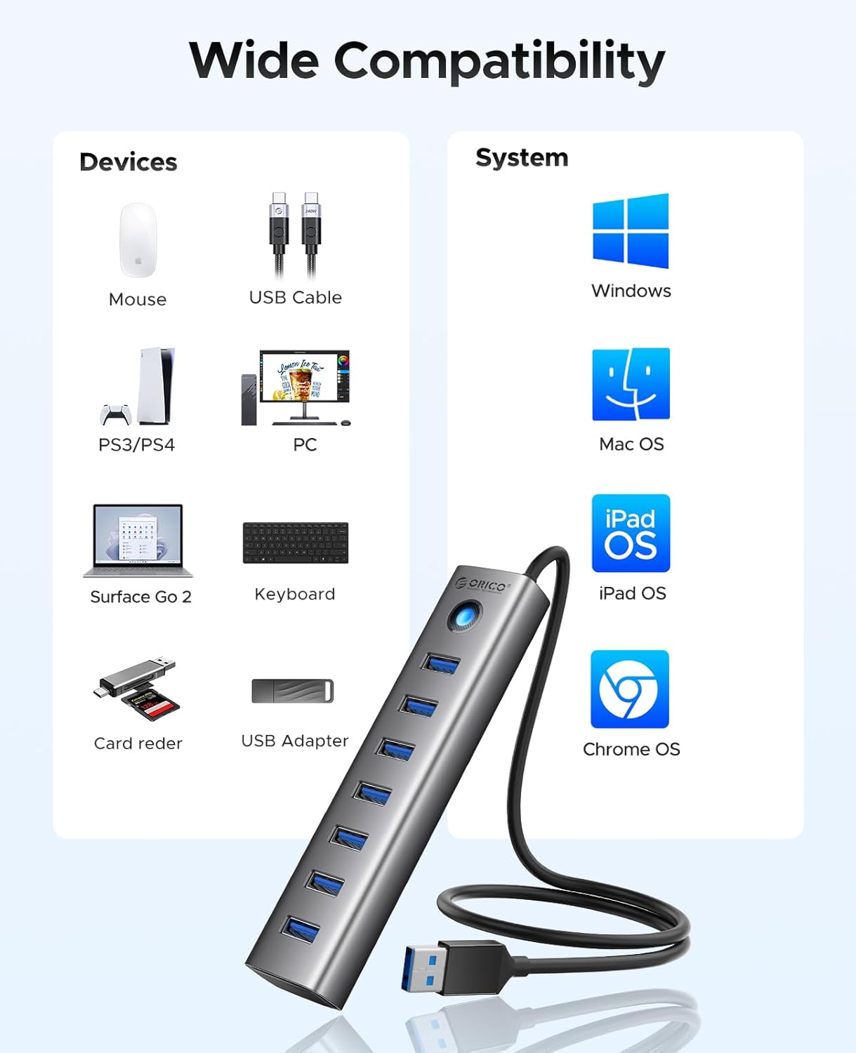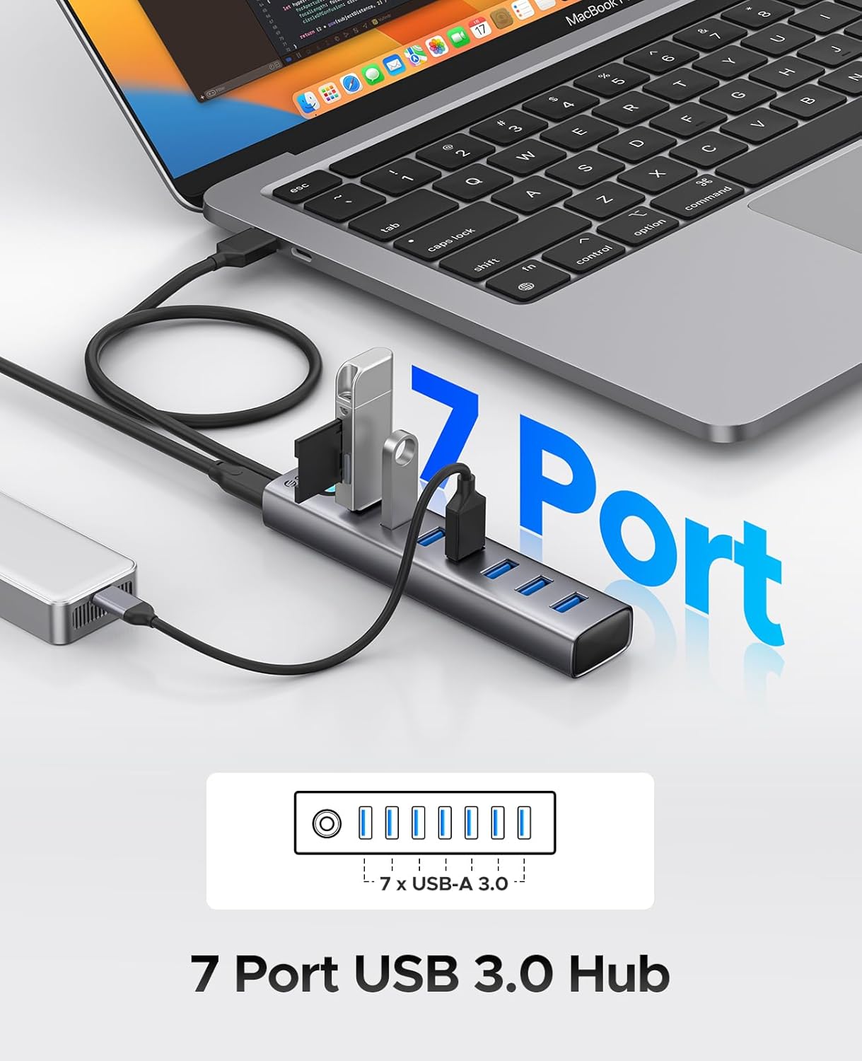 ORICO Aluminum 7-Port USB Hub with 1.64Ft Cable, Multiple USB 3.0 Hub, 5Gbps Data Transfer, 5V 3A Type-C Port, UBS-A Splitter for PC, Laptop, Desktop