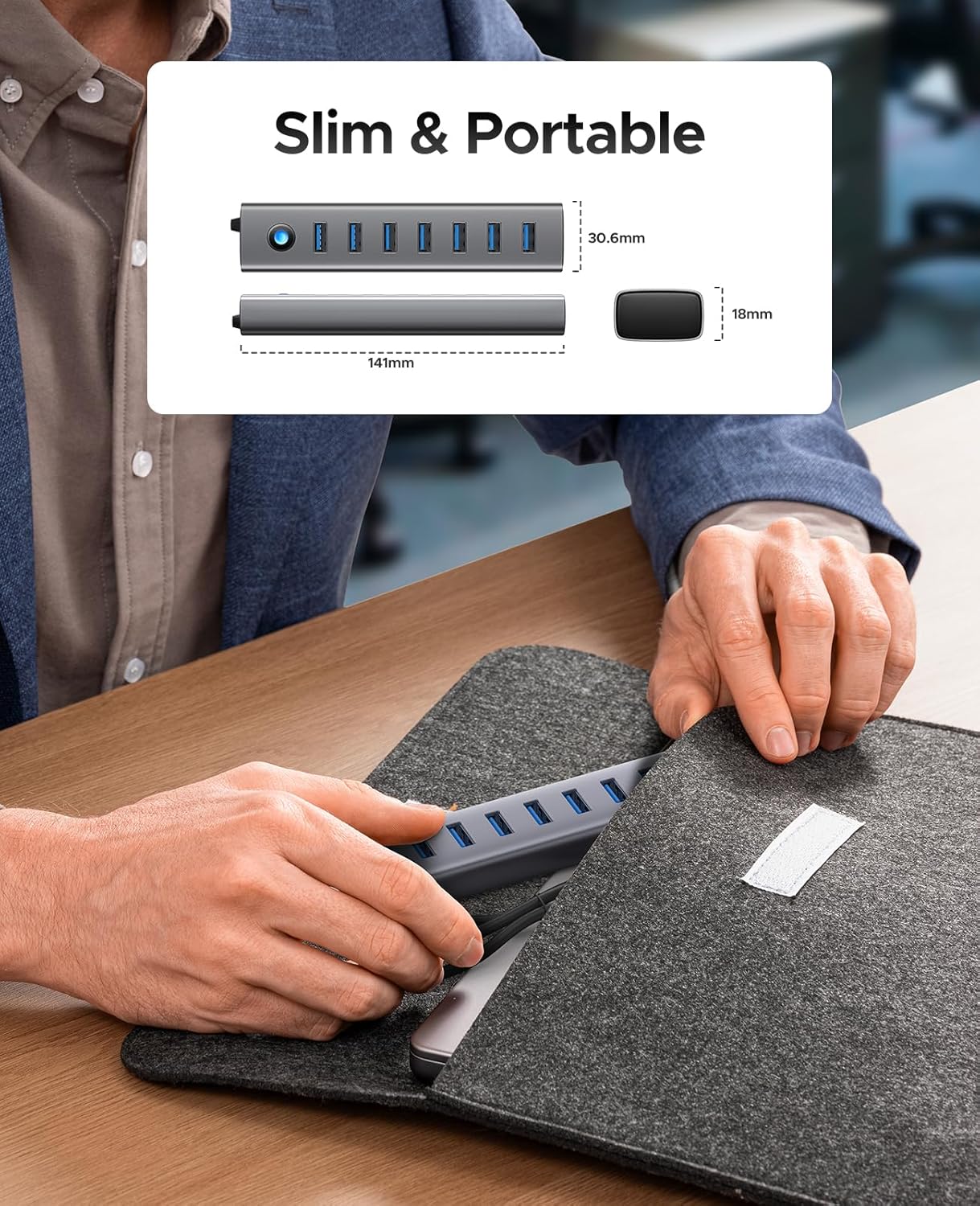 【High-Quality Material】This USB 3.0 hub is built with a high-quality aluminum alloy casing and equipped with a high-performance host chip, ensuring stable and efficient data transfer; Additionally, it features an integrated surge protector, making it lightweight, moisture-resistant, and corrosion-resistant, with a longer lifespan