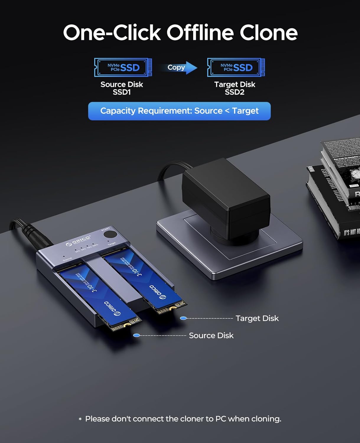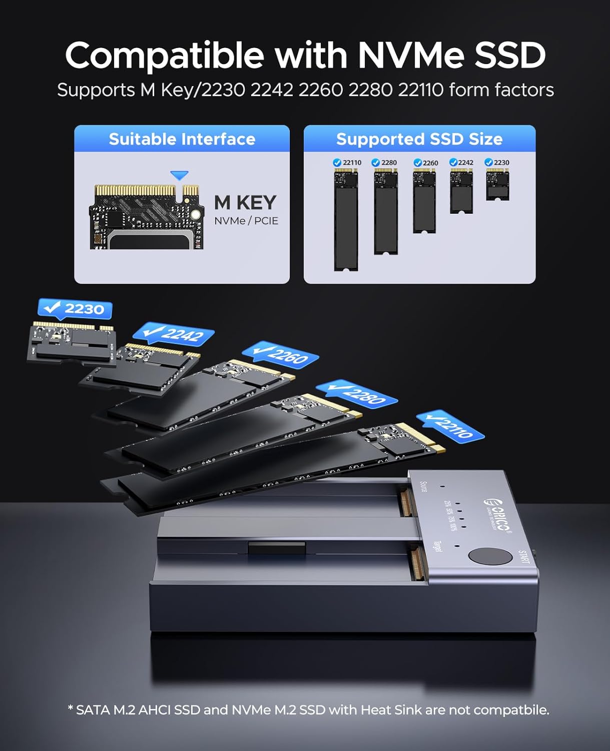 Wide Compatibility: The ORICO M.2 NVMe cloner supports M Key NVMe PCIe SSDs (22110/2280/2260/2242/2230) but is not suitable for SSDs with SATA or mSATA interfaces. It comes equipped with two silicone buckles and two thermally conductive silicone pads to securely hold the SSDs in place
