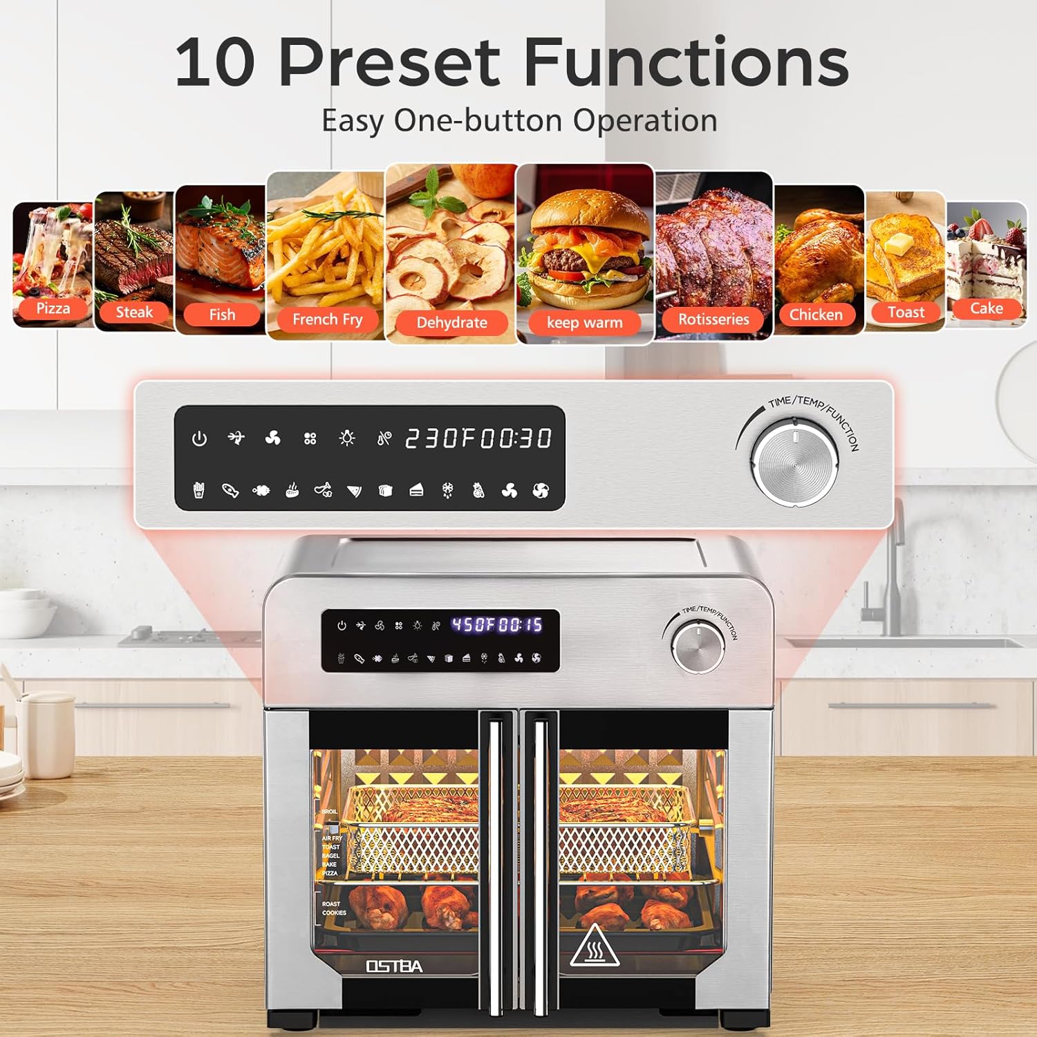 【Easy One-button Operation】This french door air fryer oven combo features 10-in-1 Functionality, featuring 8 food presets + Warm + Dehydrate function. Whether you’re frying up after-school snacks in your air fryer or baking food for a big gathering, our toaster ovens countertop makes cooking a breeze.