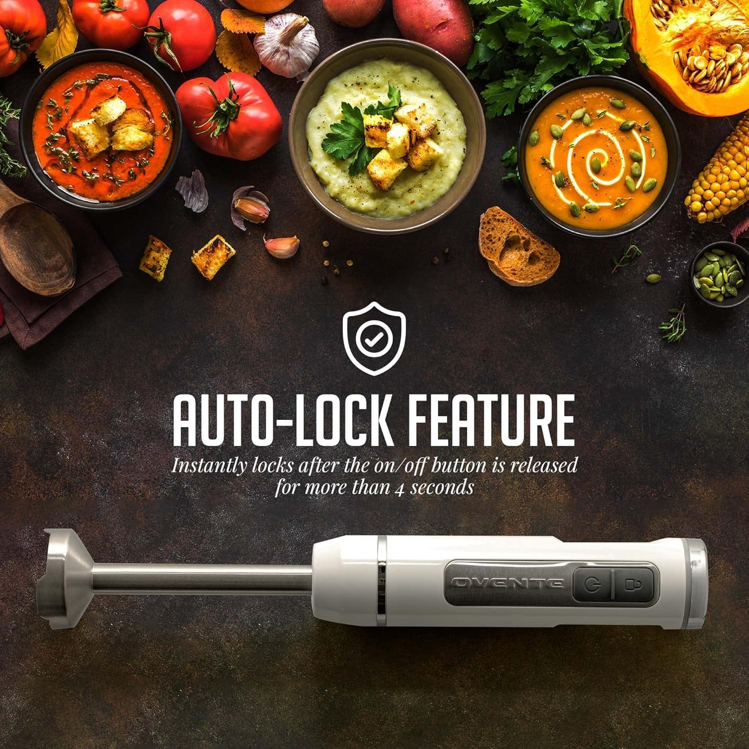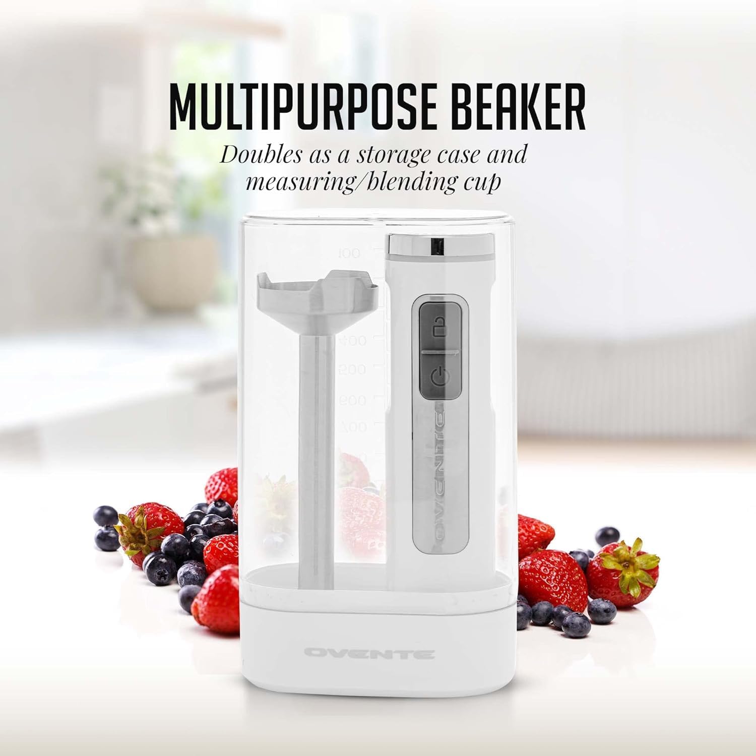 Blend your smoothies, soups, and purees anywhere, cord-free! Introducing the OVENTE Cordless Rechargeable Hand Blender HR781 Series – your ultimate kitchen companion. Forget about tangled cords and enjoy the freedom to blend wherever you are. Simply charge your blender, and when the light turns blue, it’s fully charged and ready for action. Take it anywhere in your home, whenever you need it! The ergonomic handle ensures a comfortable grip, giving you greater control over your blending. With its 8-speed settings, you’ll have precise control when making everything from salsas and shakes to smoothies and more. The blender not only provides a smooth and enjoyable blending experience but also adds a sleek, modern-minimalist touch to your kitchen. Cleaning is a breeze thanks to the detachable stainless-steel mixing shaft, making it easy to wash. The BPA-Free Storage case, which doubles as a measuring and blending cup, is perfect for space-saving – both on your countertop and in your cupboard. Blend with ease, whether you’re pureeing soups directly in the pot or making frozen treats for your friends. Powered by a 200-Watt motor, this blender lets you tackle all your blending needs efficiently, while the rechargeable, long-lasting batteries ensure hassle-free blending anytime, anywhere. Elevate your blending experience with the OVENTE Cordless Rechargeable Hand Blender HR781 Series – the perfect blend of performance, convenience, and style.