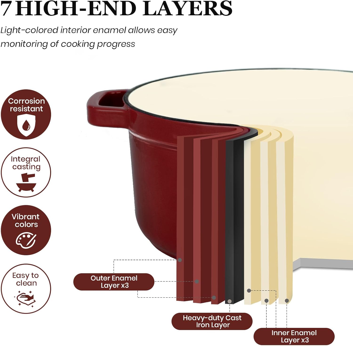 Expertly Made for Longevity: The Overmont enameled cast iron Dutch oven combines high-quality cast iron with a robust three-layer protective enamel coating. This construction includes a food-safe smooth enamel glaze that provides superior resistance to chipping and cracking. The heavy-duty design of this Dutch oven pot with lid ensures long-term durability and reliability.