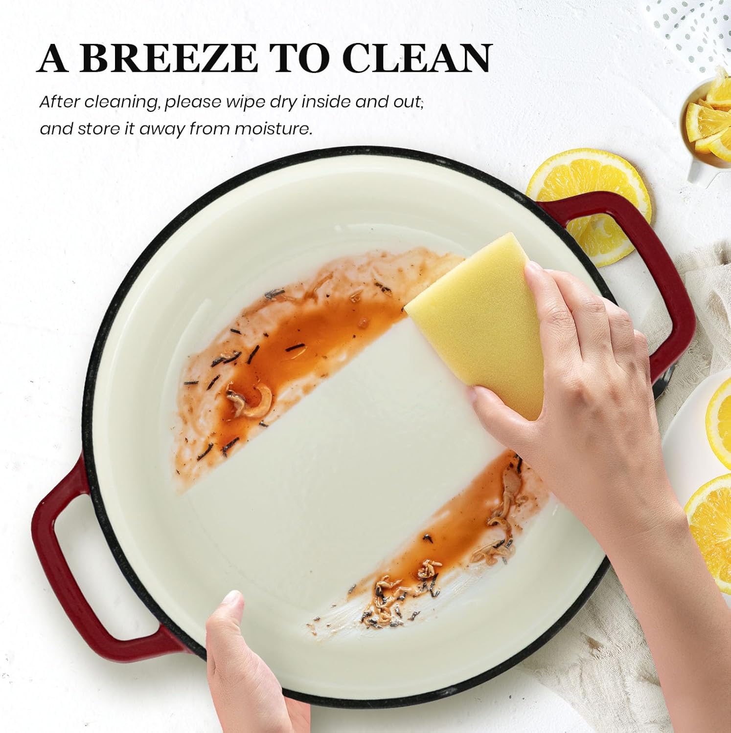 Self-Basting Lid: The Dutch oven features a self-basting lid with interior dots that promote even condensation and redistribution of moisture, ensuring your food stays moist and flavorful. The flat lid design also allows you to place ice cubes on top to help lock in moisture and prevent overcooking.