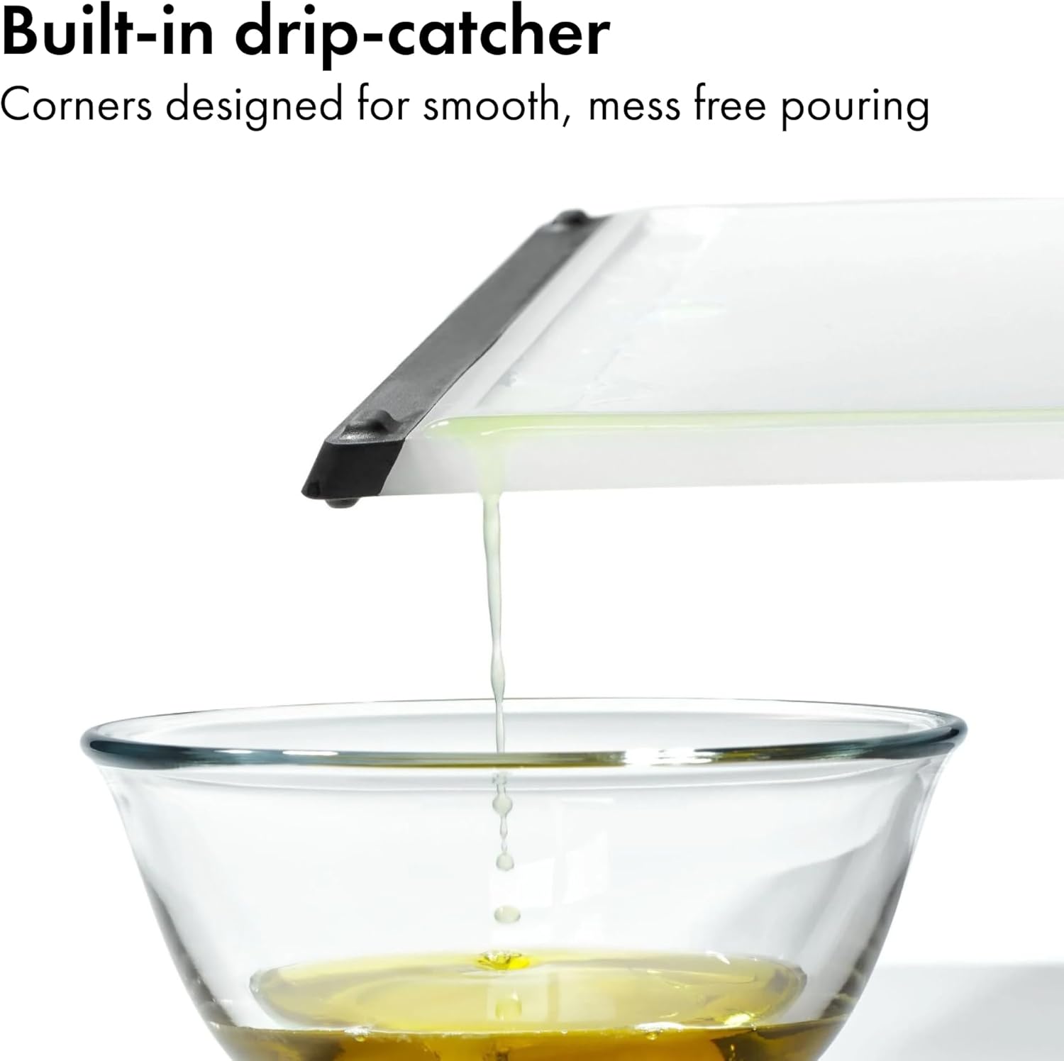 Integrated drip-catchers and easy-pour corners minimize messes