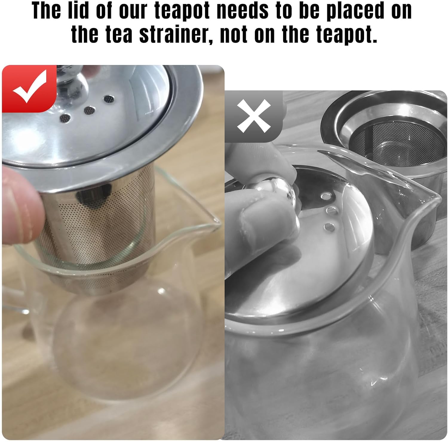【Removable Infuser】This glass teapot has a removable glass infuser. This infuser is made of 18/8 stainless steel and has an ultra-fine strainer that can filter most teas. You can use this glass tea pot to brew loose leaf tea, tea bags, blooming camellia, fruit tea, herbal tea.