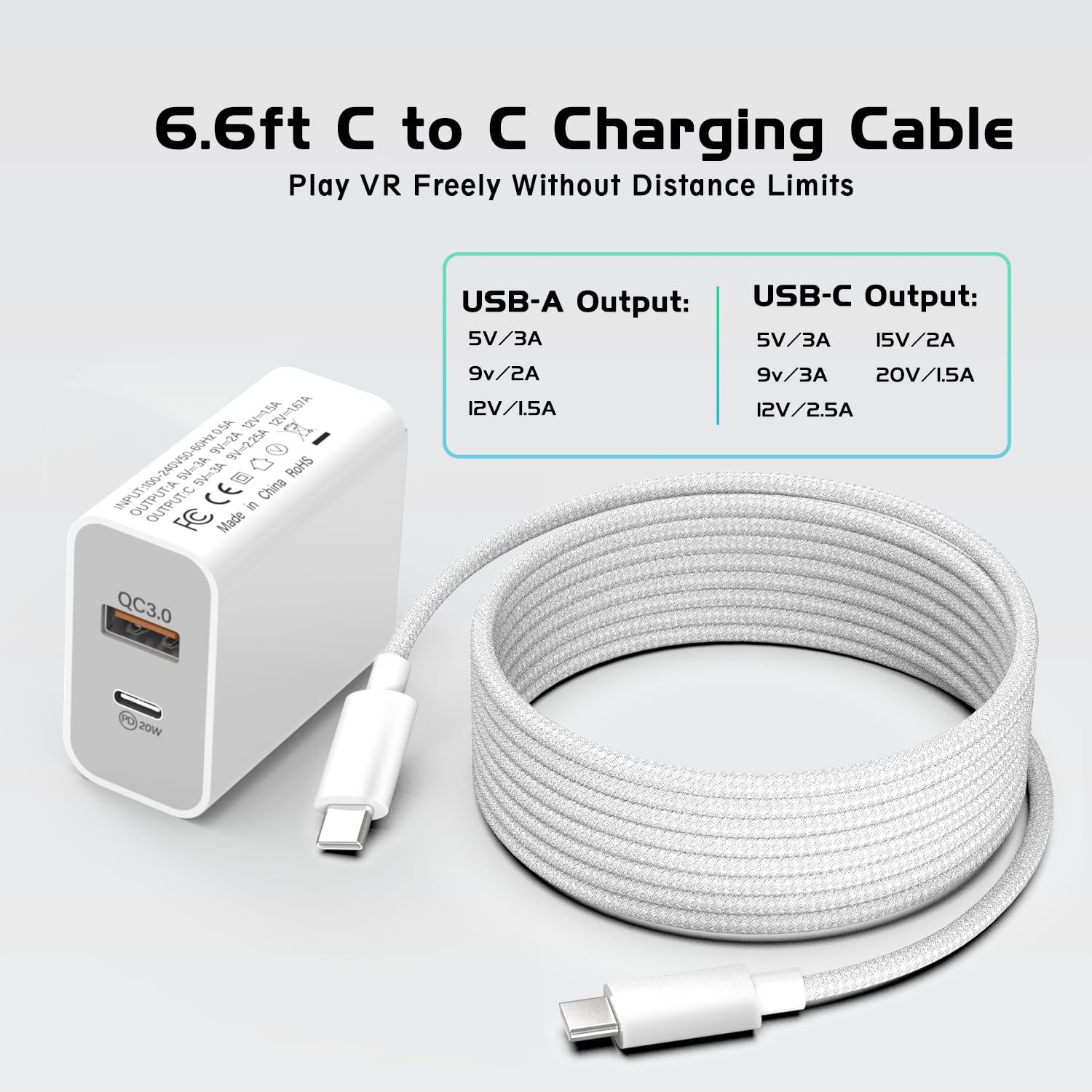 PD 20W Fast Charger Compatible with Meta Quest 3 3S VR Headset, Dual Port USB Wall Charger + Type C Power Cord for Oculus Quest 2 Headset Accessories, 6.6Ft C to C Charging Cable White