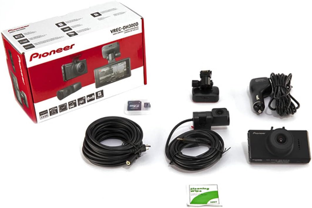 The Pioneer VREC-DH300D is a 2-channel dual recording dash camera system that mounts a Wide Quad HD (WQHD) 1440p dash camera directly to your vehicle’s front windscreen and a Full HD 1080p compact second camera to your vehicle’s rear window, capturing video of both the road ahead and behind. The main unit records a diagonal wide viewing angle of 135° with WQHD technology for enhanced imagery under low light or night conditions. The rear camera is compact and features a diagonal wide viewing angle of 128° with Full HD technology to achieve higher camera visual recognition performance in both light and dark conditions. Both front and rear cameras feature a STARVIS™ back-illuminated CMOS sensor that constantly adjusts the image quality producing bright, richly colored videos and identification-level recordings that capture critical details such as license plates, road signs, and traffic signals. Additional features include a 3″ LCD display on the front camera/main unit for easy operation and built-in GPS for speed/location/heading/time data acquisition, If an incident occurs while driving, the built-in 3-axis G-Force motion sensor will detect the vibration and automatically capture and save video 20 seconds before and after an incident is detected.
