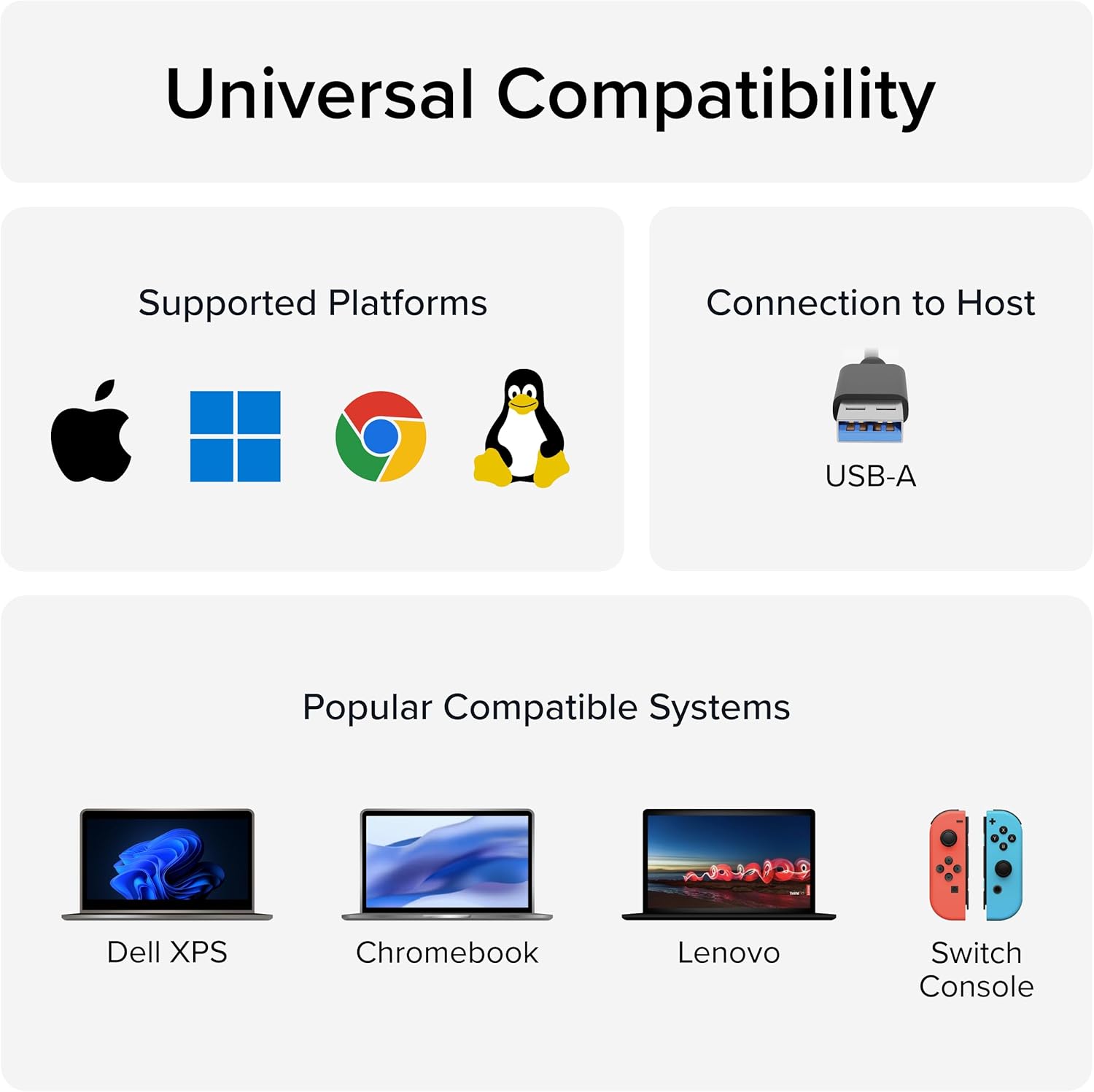Multi-Platform Support—Supports Nintendo Switch in docked mode. Compatible with macOS 11 (Big Sur), 12 (Monterey), 13 (Ventura), 14 (Sonoma),15 (Sequoia). iPadOS, Windows 11, 10, 8.x, Linux, and Chrome OS.