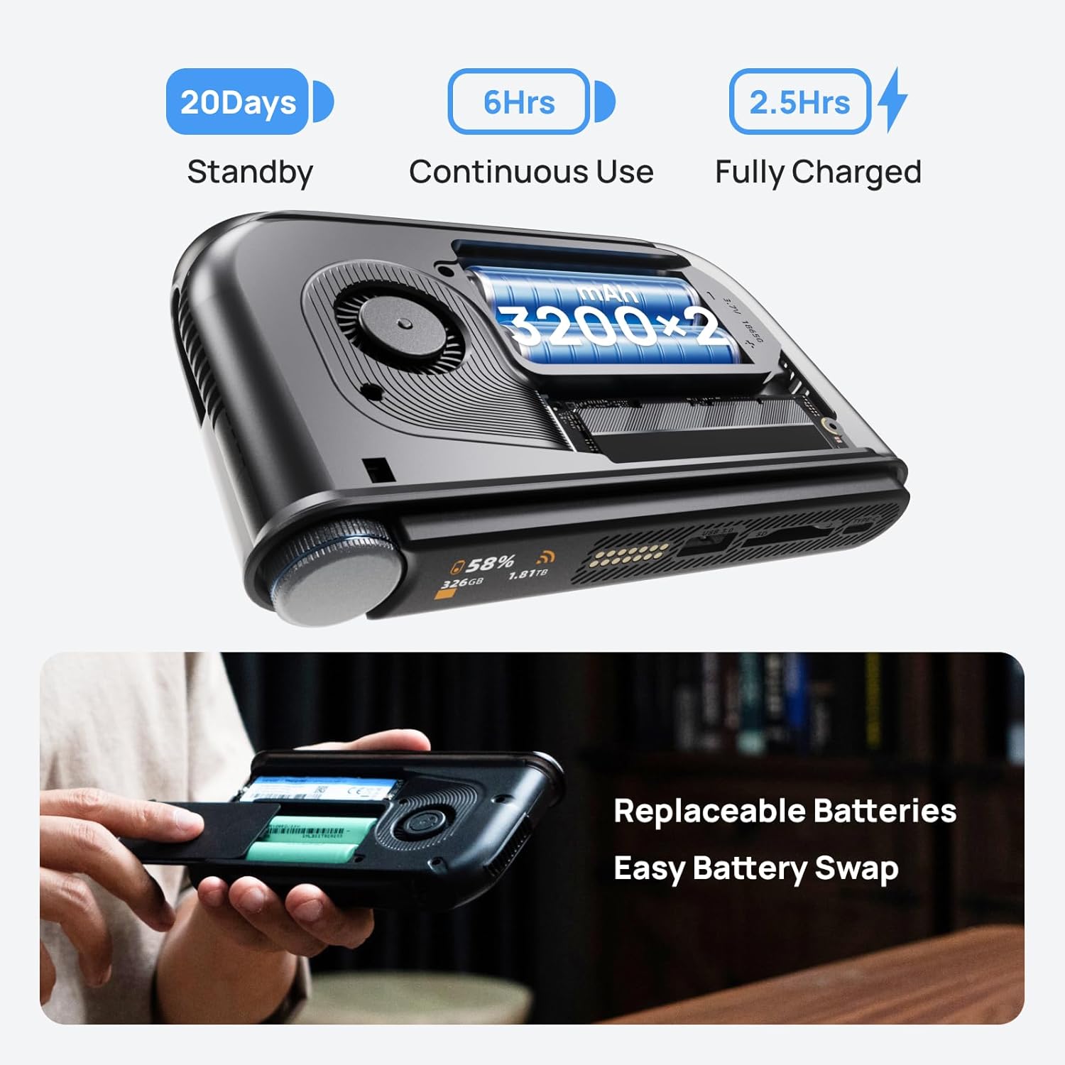 【Long-Lasting Battery Life】 – Supports fast Type-C charging and comes with Dual 3200mAh replaceable batteries for 6 hours of continuous use and up to 20 days of standby. Swap batteries anytime to extend product life, ideal for outdoor or travel use