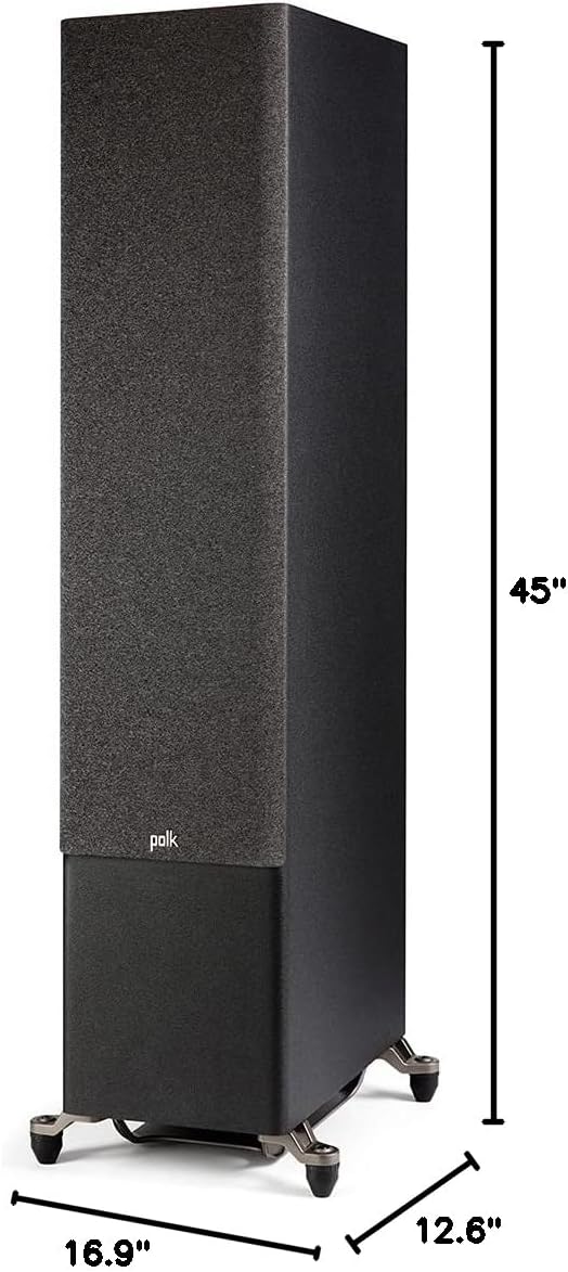 Polk Reserve R700 Premium Floorstanding Speaker for Unmatchable Audio Performance. Polk’s Reserve R700 Floorstanding Speaker is a high-performance tower loudspeaker that delivers ultra-clear and crisp highs, detailed midrange, and effortless bass. It features a 1″ Pinnacle Ring Radiator Tweeter and dual 6.5″ Turbine Cone Woofers with Hi-Res Audio Certification, Dolby Atmos, and IMAX Enhanced support to produce high-quality sound with pure detail. Whether you’re listening to music, watching movies, or playing video games, the R700’s bass reflex cabinet with a down-firing port, dual 8″ long-throw drivers, and Polk’s Patented Power Port 2.0 with X-Port Technology ensures distortion-free bass for an immersive audio experience. Its binding posts ensure an easy, efficient setup with a lossless connection. This speaker includes rubber feet for hardwood, vinyl, laminate, and tile floors, and spike feet for carpet floors. These adjustable feet allow speaker leveling according to your preference. Add another R700 tower speaker, two R200 bookshelf speakers, an R400 center channel, and three R350s & add an R900 height module for depth (all sold separately) to create a multichannel surround sound system. The R700 is compatible with the latest file formats like DSD, FLAC, WAV, ALAC, and MQA, so you can experience superior audio performance at home.